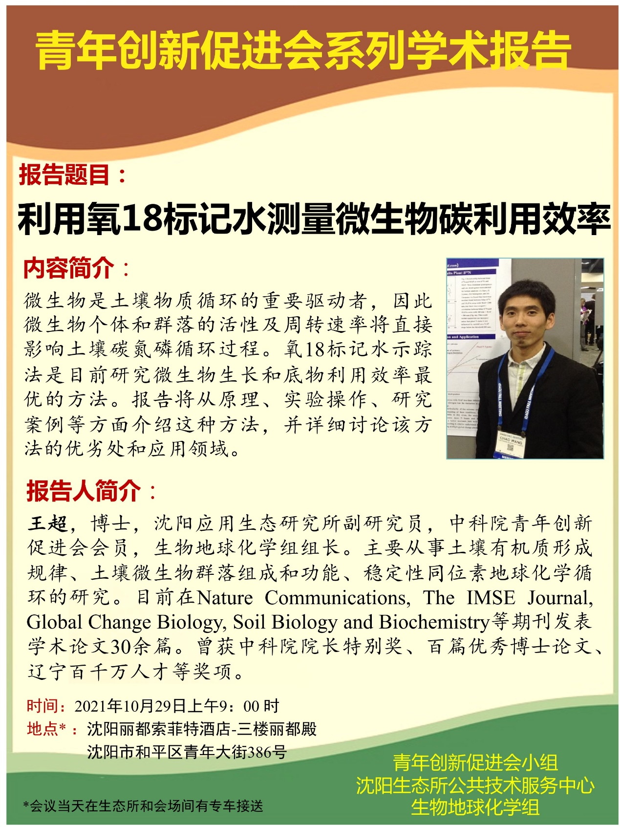 2021年10月29日,王超應(yīng)邀做沈陽黑土地技術(shù)培訓(xùn)年會—青年創(chuàng)新促進會系列學(xué)術(shù)報告,報告題目:利用氧18標(biāo)記水測量微生物碳利用效率。