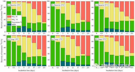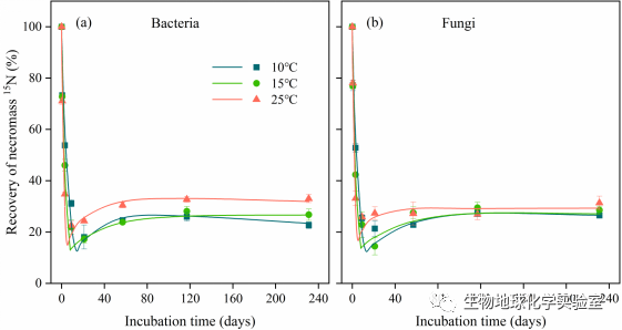圖2.不同培養(yǎng)溫度條件下微生物殘留物15N回收率隨時間的變化