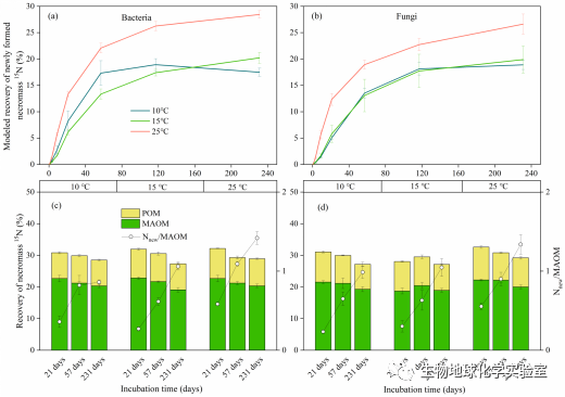 圖3.模型模擬新形成微生物殘留物15N回收率隨時間的變化以及微生物殘留物15N在顆粒有機物和礦物有機物復合體組分回收率隨時間的變化