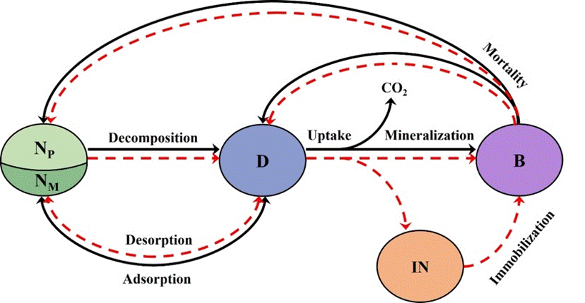 圖1. 微生物殘留物碳和氮循環(huán)的概念模型圖(黑色實(shí)線和紅色虛線分別表示碳和氮過程)