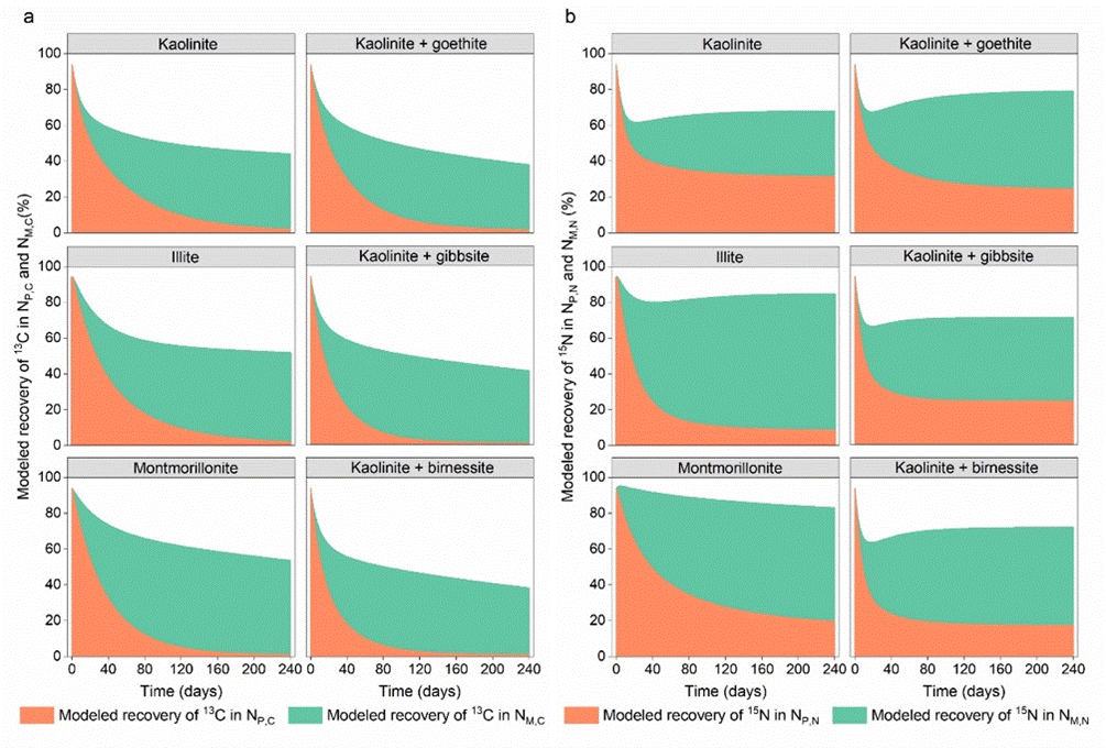 圖2. 微生物殘留物13C(a)和15N(b)在顆粒性有機(jī)質(zhì)(NP,C和NP,N)和礦物結(jié)合有機(jī)質(zhì)(NM,C和NM,N)中的回收率模擬值。