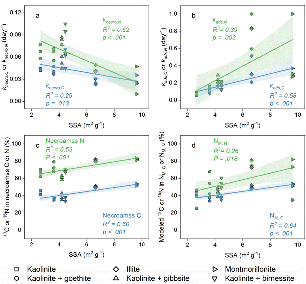圖3. 土壤比表面積對微生物殘留物碳和氮礦化速率常數(shù)(a)、吸附率常數(shù)(b)、土壤殘留物13C和15N回收率(c)和礦物結(jié)合有機(jī)質(zhì)中殘留物13C和15N模擬回收率(d)的影響。