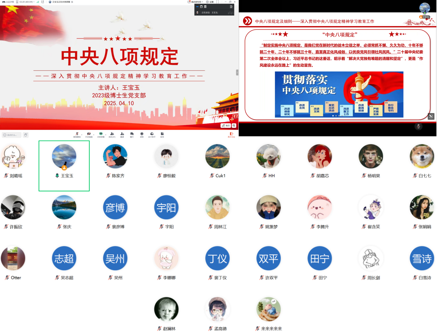 為深入貫徹中央八項規(guī)定精神學(xué)習(xí)教育,按照黨群辦公室的安排,2025年4?10?,沈陽?態(tài)所23級博?黨?部通過線上形式召開全體黨員?會,開展《習(xí)近平關(guān)于加強黨的作風(fēng)建設(shè)論述摘編》和深入學(xué)習(xí)中央八項規(guī)定及其實施細(xì)則精神的學(xué)習(xí),?部書記王寶?主持?部?會。