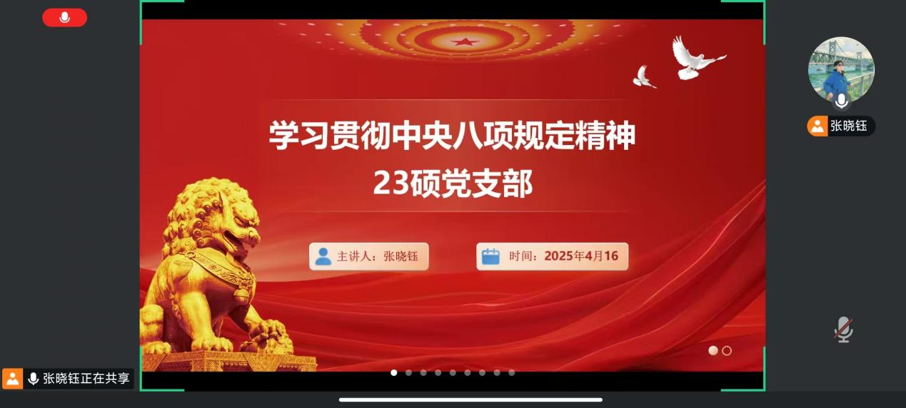 為深入貫徹習(xí)近平新時(shí)代中國(guó)特色社會(huì)主義思想,持續(xù)強(qiáng)化中央八項(xiàng)規(guī)定精神的貫徹落實(shí),按照黨群辦公室安排,2025年4月16日晚,沈陽(yáng)生態(tài)所23級(jí)碩士黨支部依托線上會(huì)議召開(kāi)全體黨員大會(huì)。本次會(huì)議旨在對(duì)中央八項(xiàng)規(guī)定及其實(shí)施細(xì)則精神進(jìn)行深度學(xué)習(xí),會(huì)議由支部書(shū)記張曉鈺主持。