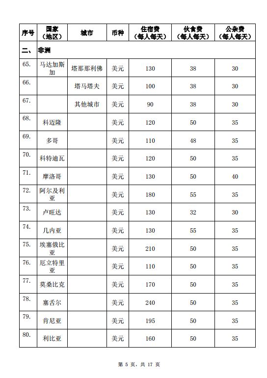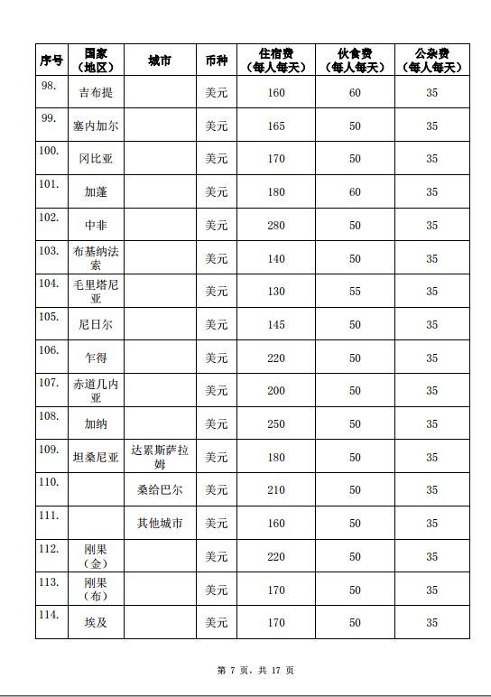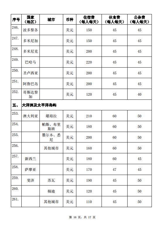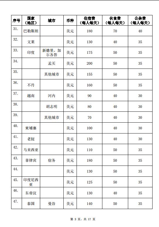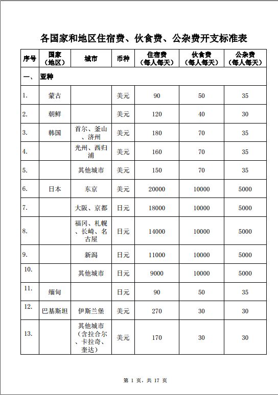 2018年最新各國和地區(qū)住宿費、伙食費、公雜費開支標(biāo)準(zhǔn)表