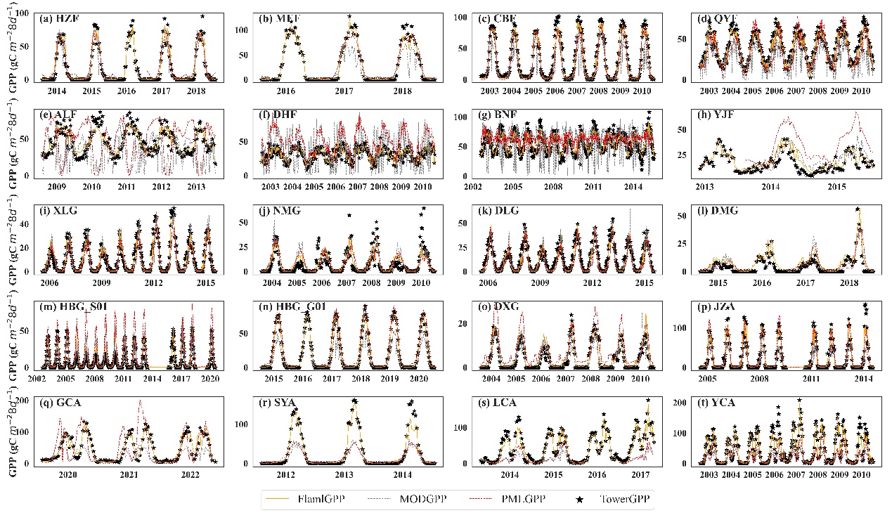 在GPP模擬方面,沈陽生態(tài)所生態(tài)氣候組團(tuán)隊基于衛(wèi)星的光能利用率模型(LUE),采用FLAML輕量級自動化機(jī)器學(xué)習(xí)框架,開發(fā)了FLAML-LUE模型,結(jié)合氣象數(shù)據(jù)、渦度協(xié)方差觀測和遙感指數(shù),評估了不同時間尺度下各類變量組合對GPP模擬的影響。研究結(jié)果發(fā)現(xiàn)FLAML-LUE模型在GPP預(yù)測中表現(xiàn)優(yōu)異,能準(zhǔn)確模擬其時間動態(tài)和量級,尤其在混交林和針葉林中優(yōu)勢顯著;在高寒灌叢和典型草地生態(tài)系統(tǒng)中表現(xiàn)稍差,但其精度仍優(yōu)于MODIS和PML GPP產(chǎn)品。模型在高溫和高飽和水汽壓差的極端條件下,模擬精度輕微下降;干旱條件下,模型在農(nóng)田和常綠闊葉林的表現(xiàn)略有提升。本研究為評估區(qū)域尺度不同生態(tài)系統(tǒng)類型GPP提供了新方法。成果以FLAML version 2.3.3 model-based assessment of gross primary productivity at forest,grassland,and cropland ecosystem sites為題發(fā)表于歐洲地球科學(xué)聯(lián)合會(EGU)旗下期刊《Geoscientific Model Development》,來潔博士研究生為第一作者,吳家兵研究員為通訊作者。