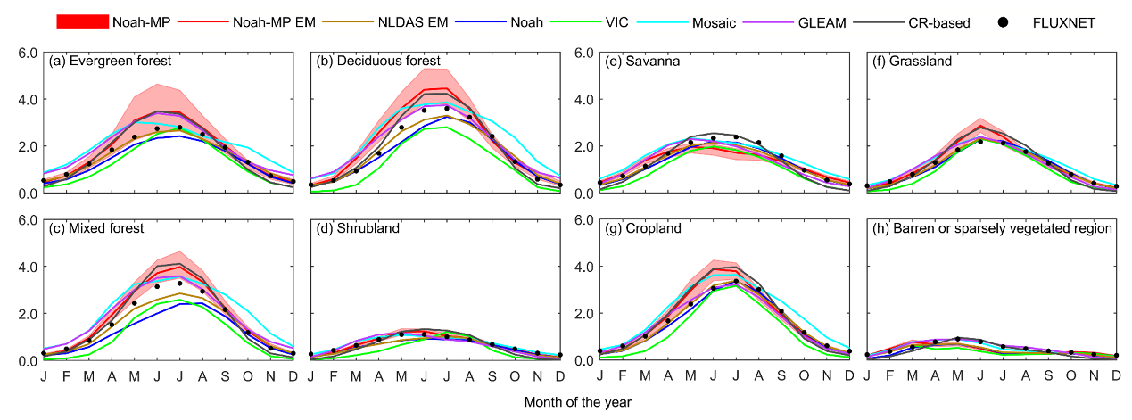圖2 Noah-MP集合與多源ET產(chǎn)品在8種土地覆蓋類型下對ET年循環(huán)的對比評估