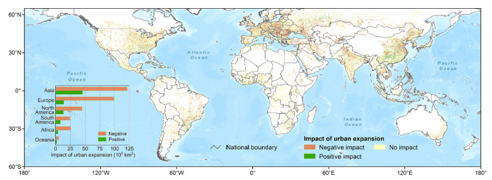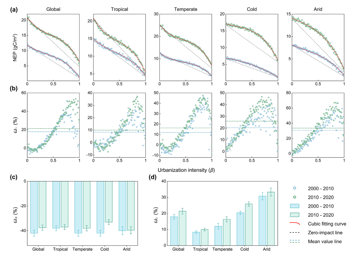 當(dāng)前,全球城市擴(kuò)張進(jìn)程顯著加速,深刻改變了陸地生態(tài)系統(tǒng)的結(jié)構(gòu)與功能?!拔磥淼厍颉庇?jì)劃明確提出提升城市可持續(xù)性的重要性,而城市擴(kuò)張已不再是單一的土地覆蓋變化過程,而是疊加了生物地球化學(xué)循環(huán)重構(gòu)、景觀格局破碎化、局地氣候改變等多維復(fù)雜效應(yīng)。城市地區(qū)因較早暴露于氣候、大氣和地球系統(tǒng)變化而被視為研究未來全球變化的“天然實(shí)驗(yàn)室”。在全球變化和人口增長加劇的背景下,提升陸地生態(tài)系統(tǒng)中植被的凈生態(tài)系統(tǒng)生產(chǎn)力(NEP),以增強(qiáng)碳匯能力、緩解氣候變暖,已成為國際社會的共同目標(biāo)。然而,受限于觀測數(shù)據(jù)和模型模擬能力,過去二十年全球尺度上NEP的時(shí)空變化特征及其對城市擴(kuò)張的響應(yīng)機(jī)制仍不明確,特別是在不同城市發(fā)展階段和規(guī)模背景下,其影響路徑和差異性尚缺乏系統(tǒng)認(rèn)識。針對這一科學(xué)問題,中國科學(xué)院沈陽應(yīng)用生態(tài)研究所景觀生態(tài)組以NEP表征植被固碳能力,探究了全球城市擴(kuò)張對植被固碳能力的影響,取得了以下重要進(jìn)展: