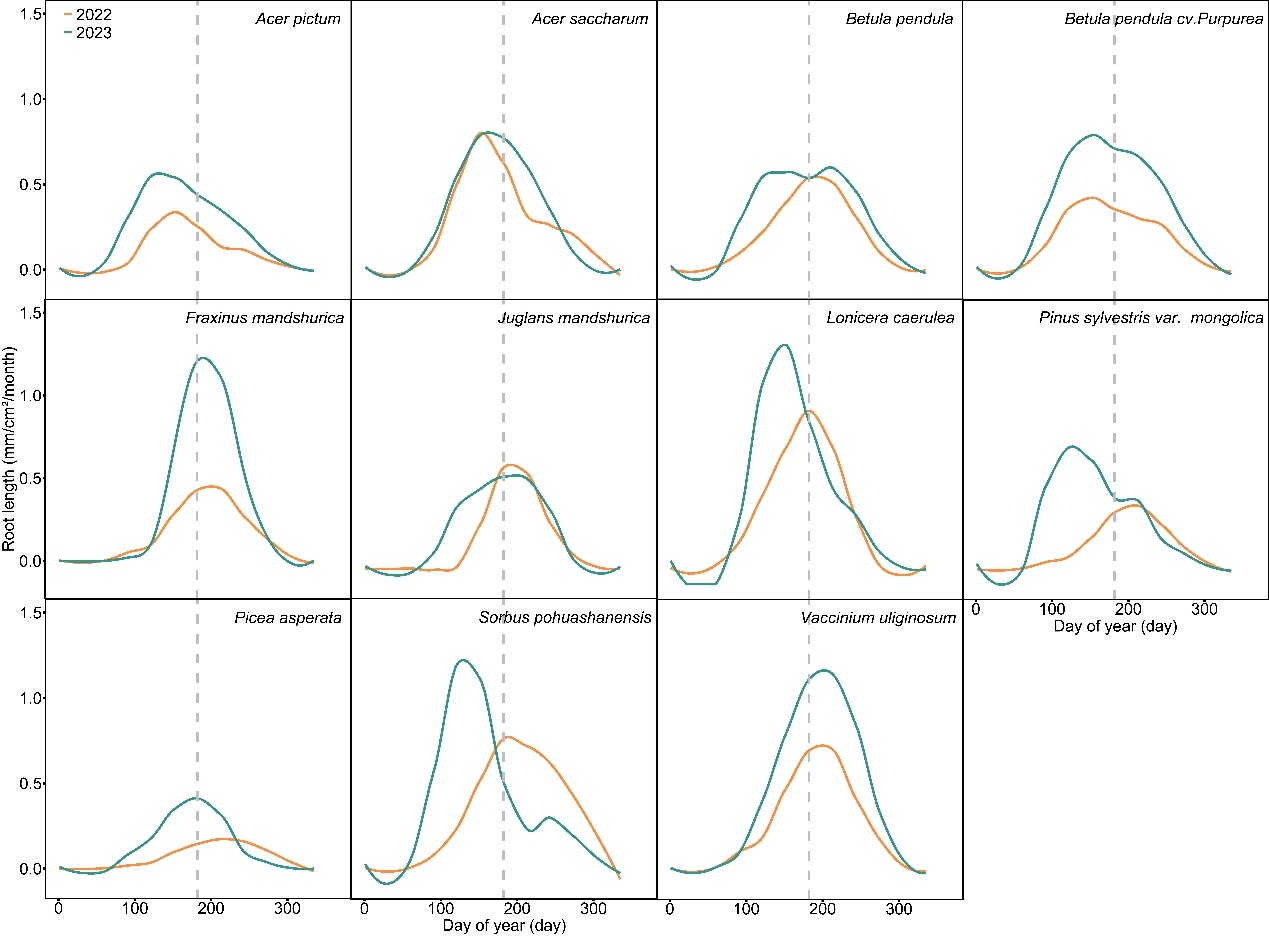 圖1. 11個(gè)溫帶人工林樹種細(xì)根生長(zhǎng)的模式。