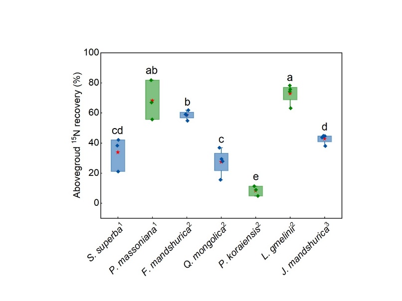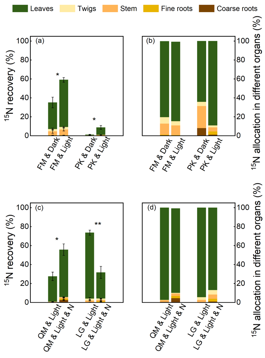 為了評估森林喬木葉片對NO2的吸收能力以及分配策略,中國科學(xué)院沈陽應(yīng)用生態(tài)研究所穩(wěn)定同位素生態(tài)學(xué)團(tuán)隊(duì)利用15N同位素示蹤技術(shù),選取中國東北溫帶森林四種優(yōu)勢喬木樹種幼苗(蒙古櫟、水曲柳、落葉松、紅松),在不同光照或土壤施氮條件下,利用50 ppb的 15NO2對喬木幼苗進(jìn)行8 h的動態(tài)熏蒸,量化了喬木幼苗葉片對NO2的吸收與分配。