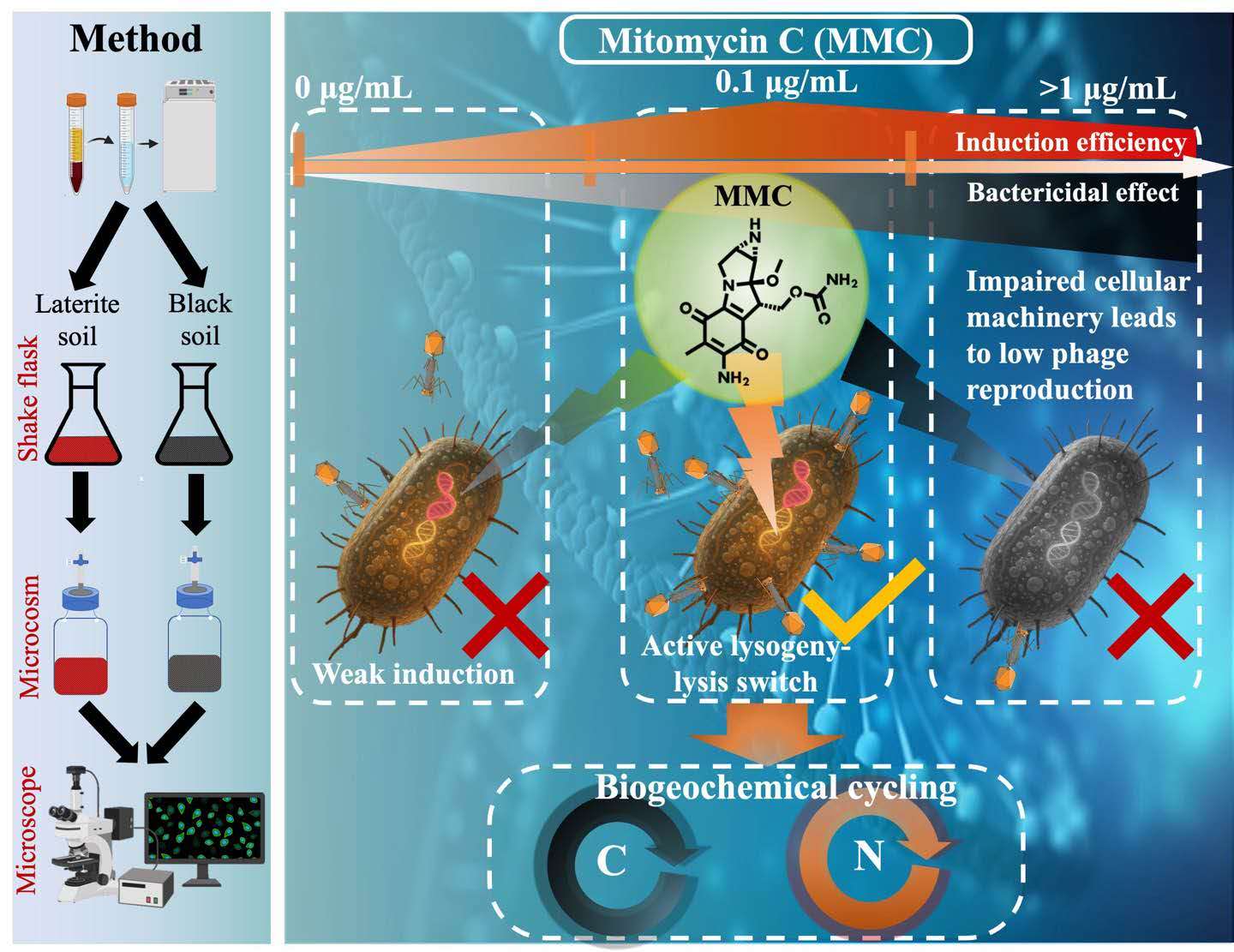 然而,環(huán)境中溶原性噬菌體的研究長期受到方法學(xué)缺失的制約?,F(xiàn)有研究主要依賴化學(xué)誘導(dǎo)劑——絲裂霉素C(Mitomycin C,MMC),但該方法存在顯著不確定性:其作用強度在不同環(huán)境中差異巨大,既可能低估溶原性噬菌體的真實數(shù)量,也可能因?qū)λ拗魑⑸镌斐啥拘杂绊懚で芯拷Y(jié)果。因此,如何發(fā)展更加可靠的方法來研究環(huán)境中的溶原性噬菌體,成為該領(lǐng)域亟待解決的關(guān)鍵科學(xué)問題。
