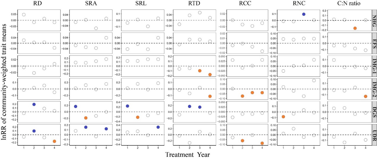 圖 1細(xì)根性狀群落加權(quán)均值對(duì)4年實(shí)驗(yàn)性干旱的對(duì)數(shù)響應(yīng)比(lnRR=ln(干旱/對(duì)照))