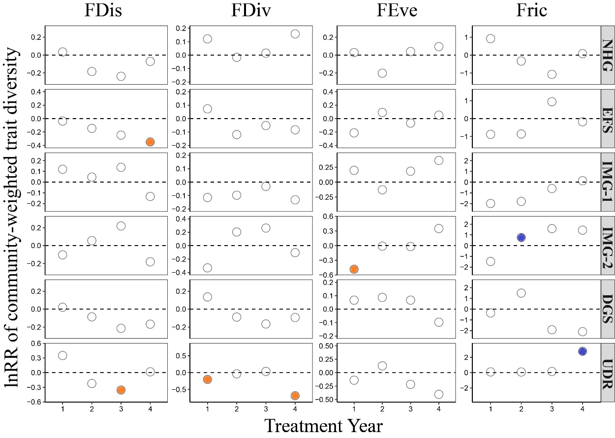 圖 2細(xì)根性狀群落功能多樣性對(duì)4年實(shí)驗(yàn)性干旱的對(duì)數(shù)響應(yīng)比(lnRR=ln(干旱/對(duì)照))