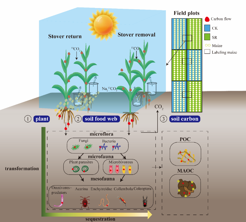 在應對全球氣候變化與農(nóng)業(yè)可持續(xù)發(fā)展的挑戰(zhàn)中,如何通過農(nóng)業(yè)管理措施提升土壤碳匯能力、優(yōu)化碳循環(huán)過程,成為保障土壤生態(tài)功能與資源高效利用的核心問題。作物通過光合作用固定大氣中的 CO?(光合碳)是土壤碳固存的重要前體,而秸稈還田作為典型的保護性農(nóng)業(yè)措施,既能補充土壤碳源與養(yǎng)分,又能激活土壤食物網(wǎng)。為此,中國科學院沈陽應用生態(tài)研究所土壤健康維持機制與生物調(diào)控途徑創(chuàng)新組群在遼寧沈陽農(nóng)田生態(tài)系統(tǒng)國家野外觀測研究站,利用田間試驗與13C同位素標記微區(qū)試驗(圖1),系統(tǒng)探究了秸稈還田條件下土壤食物網(wǎng)介導的光合碳轉(zhuǎn)化及土壤碳固存的調(diào)控機制。