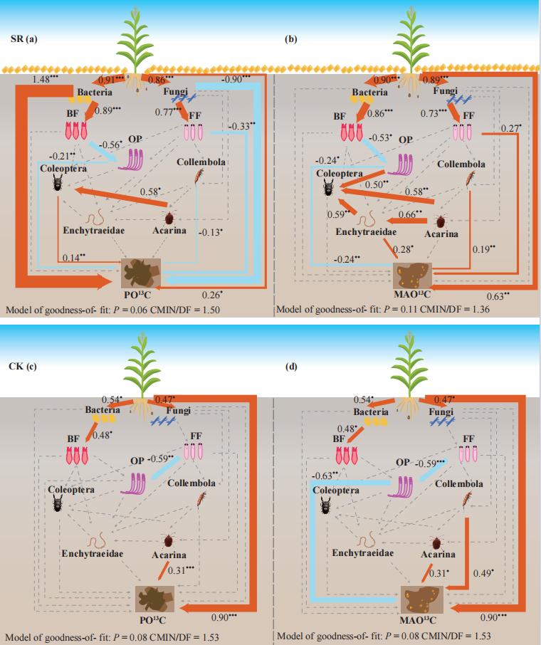 綜上,該研究率先明確了“秸稈還田→土壤食物網(wǎng)重構(gòu)→光合碳高效轉(zhuǎn)化→土壤碳固存”的鏈式調(diào)控機制,證實秸稈還田通過激發(fā)效應與更新效應的協(xié)同作用,推動光合碳向土壤穩(wěn)定碳庫分配,且小型土壤動物在其中發(fā)揮核心調(diào)控作用。研究結(jié)果為優(yōu)化保護性農(nóng)業(yè)措施、提升農(nóng)田土壤碳匯能力提供了關鍵的生物學依據(jù),同時也為理解“地上—地下生態(tài)系統(tǒng)協(xié)同調(diào)控”機制提供了新視角。