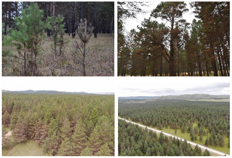 然而,自2018年開始,紅花爾基地區(qū)的沙地樟子松天然林出現(xiàn)枝葉變黃、繼而整株萎蔫、最后枯死等衰退現(xiàn)象,引起廣泛關(guān)注(圖1)。盡管這種衰退現(xiàn)象已有詳實(shí)記錄,但是其衰退機(jī)制仍然不清楚?;谏车卣磷铀商烊涣炙ネ诉^程和現(xiàn)狀,中國科學(xué)院沈陽應(yīng)用生態(tài)研究所北方生態(tài)屏障功能形成維持機(jī)制與提質(zhì)增效創(chuàng)新團(tuán)隊(duì),提出2個(gè)相互關(guān)聯(lián)驅(qū)動沙地樟子松天然林衰退的假設(shè):(1)人為防火措施延長了自然林火發(fā)生的間隔期,導(dǎo)致林內(nèi)病原菌富集和害蟲數(shù)量增多,從而引發(fā)樟子松天然林出現(xiàn)衰退現(xiàn)象;(2)氣候變化導(dǎo)致沙地樟子松天然林區(qū)冬季氣溫升高,引起冬季積雪變薄或積雪覆蓋時(shí)間縮短,造成早春積雪融水補(bǔ)充土壤水分量減少,致使樟子松天然林生長關(guān)鍵時(shí)期土壤水分不足,導(dǎo)致樹木生長勢衰弱;招致病蟲害侵染,加劇樹勢衰弱程度,進(jìn)而引起沙地樟子松天然林出現(xiàn)衰退現(xiàn)象。