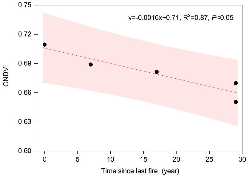 圖2 沙地樟子松天然林林火缺失時(shí)間與綠色歸一化植被指數(shù)(GNDVI)關(guān)系