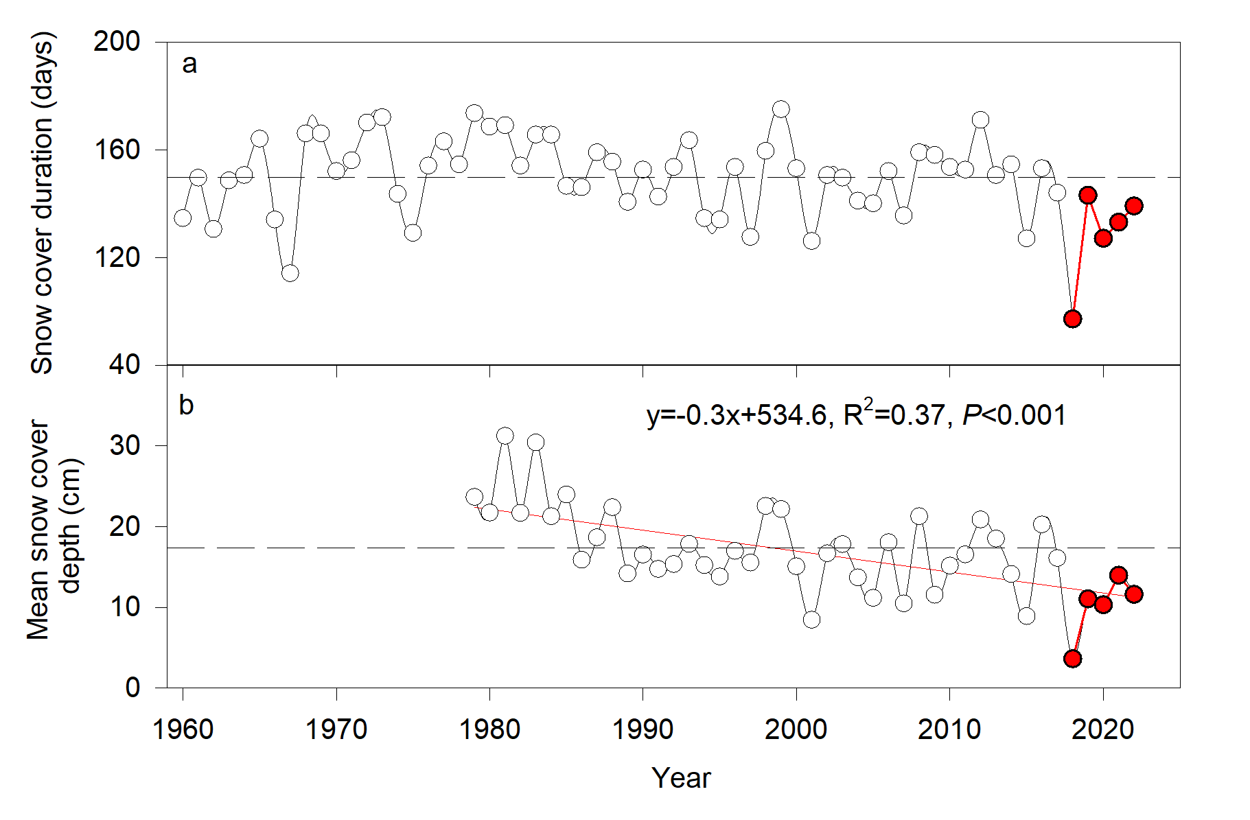 圖3沙地樟子松天然林區(qū)1960-2022年冬季積雪覆蓋天數(shù)(a)和積雪覆蓋厚度動態(tài)(b)
