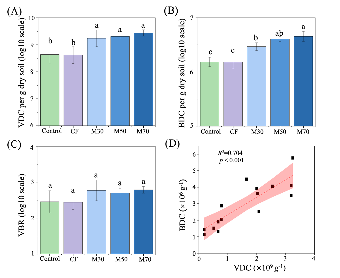 圖1. 不同施肥策略下病毒與細菌豐度。(A)病毒顆粒的豐度;(B)細菌細胞的豐度;(C)病毒顆粒與細菌細胞數(shù)量的比值;(D)病毒豐度與細菌豐度的關系。Control表示無施肥處理;CF表示施加化肥處理;M30、M50、M70分別表示施用有機肥代替30%、50%、70%化學氮肥處理。