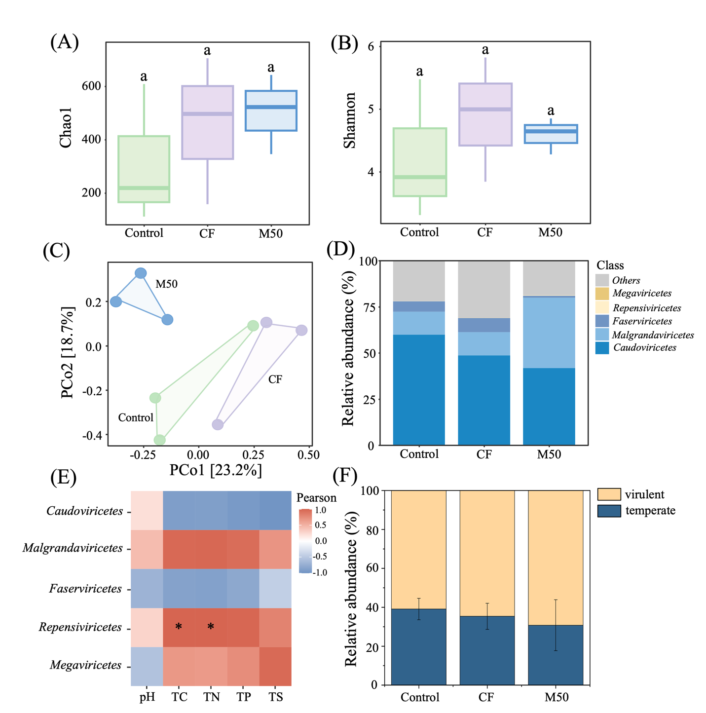 圖2. 不同施肥策略下病毒群落的組成與生存策略。(A)病毒群落的Chao1指數(shù);(B)病毒群落的香農指數(shù);(C)病毒群落組成的主成分分析;(D)病毒綱水平的相對豐度;(E)環(huán)境因子與病毒關聯(lián)分析;(F)溫和噬菌體與烈性噬菌體的相對比例。