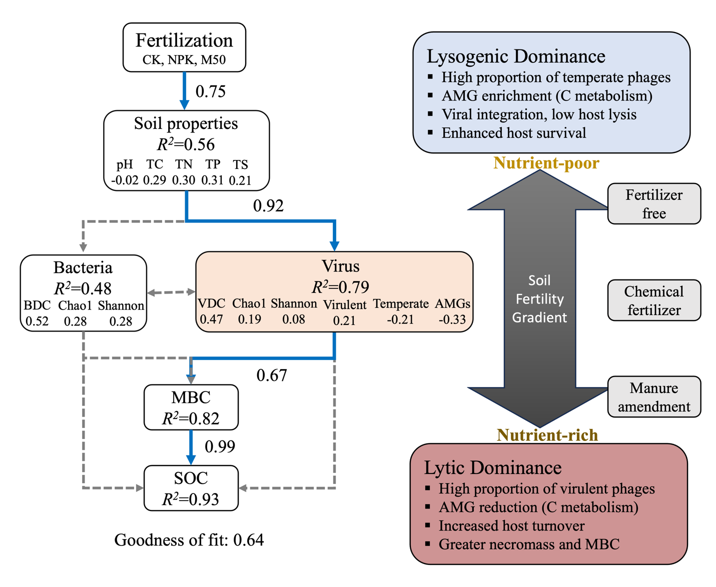 圖3. 長期施肥條件下病毒對土壤有機碳的調控作用。