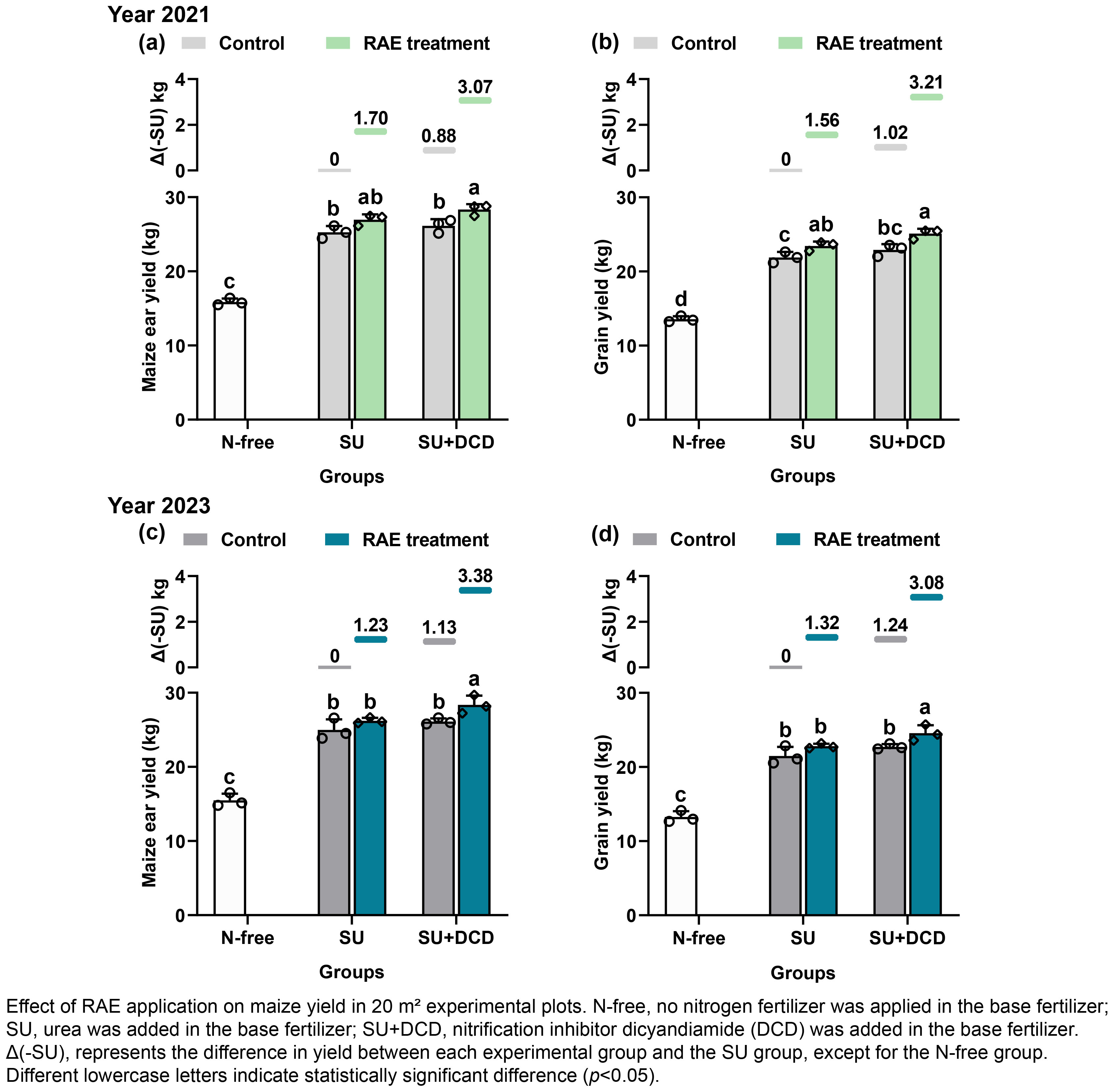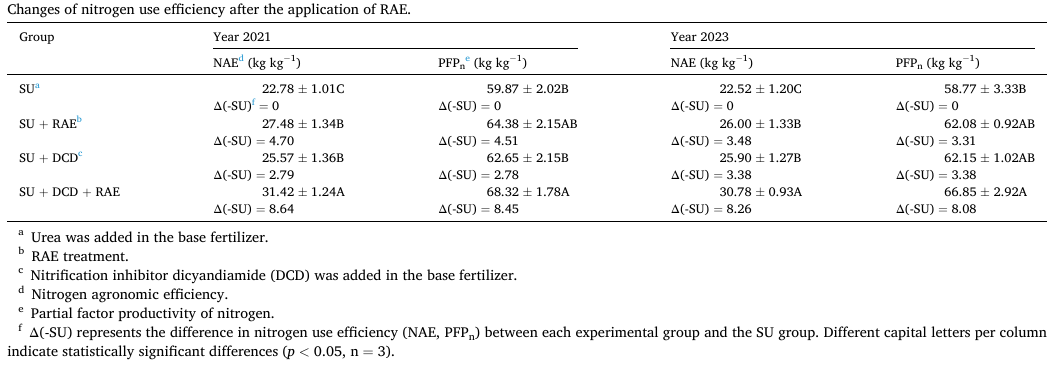 土肥水高效利用與綠色肥料創(chuàng)新組群,通過田間試驗(yàn)系統(tǒng)評(píng)估了RAE與DCD單獨(dú)及聯(lián)合施用對(duì)玉米產(chǎn)量、氮肥利用效率及N?O排放的影響。研究發(fā)現(xiàn),與對(duì)照處理相比,RAE單獨(dú)施用可提高玉米籽粒產(chǎn)量6.13–7.11%,使氮肥農(nóng)學(xué)效率(NAE)和氮肥偏生產(chǎn)力(PFP?)分別提高15.45–20.63%和5.63–7.53%。RAE與DCD聯(lián)合施用則表現(xiàn)出顯著的協(xié)同增效作用:玉米產(chǎn)量增幅達(dá)14.31–14.67%,NAE與PFP?分別提升36.70–37.93%與13.77–14.11%,其增幅遠(yuǎn)超兩者單獨(dú)效應(yīng)之和(DCD 使 NAE 和 PFPn 分別提高 12.24–15.01% 和 4.64–5.75%)。