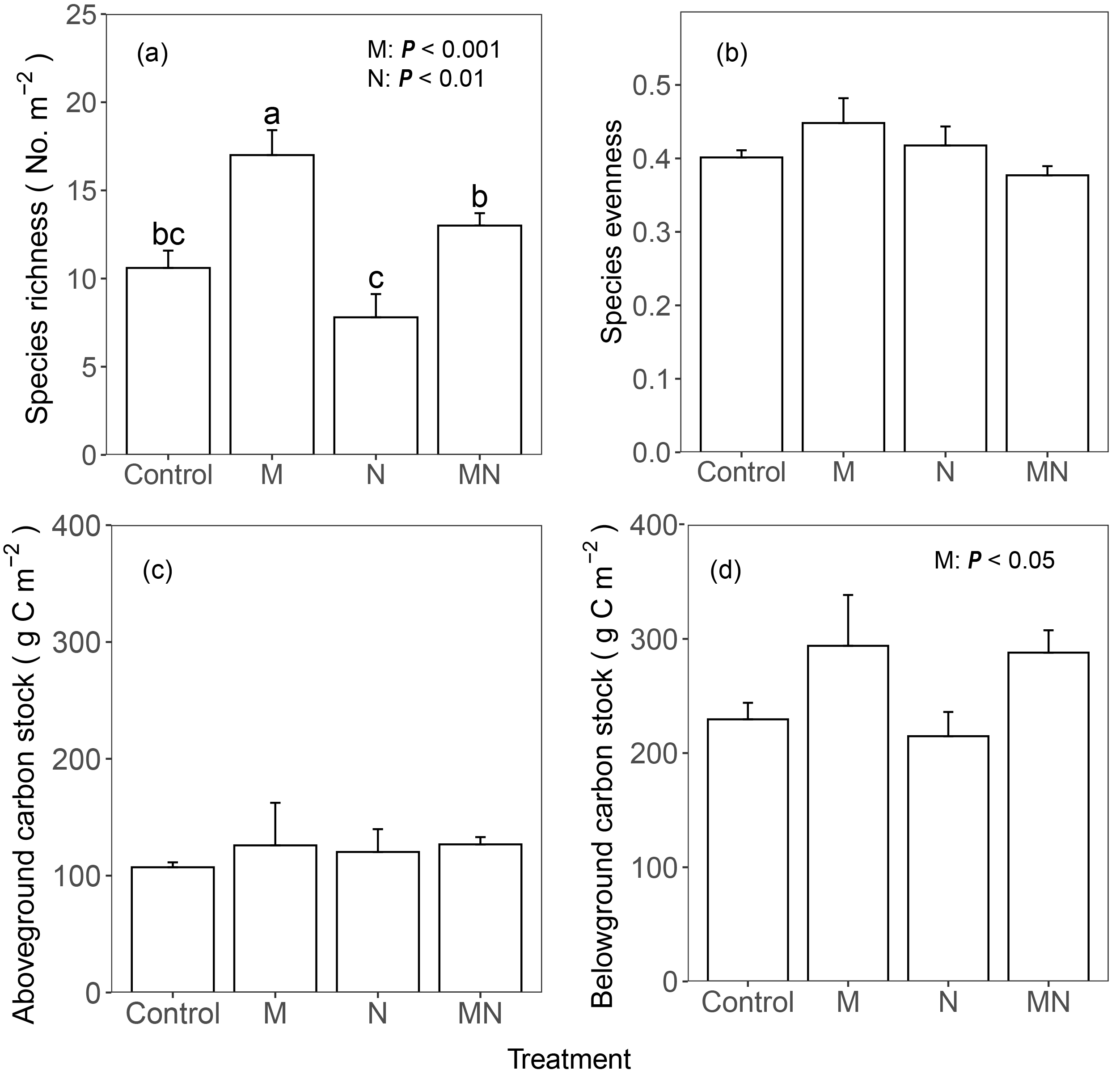 圖1刈割和氮添加對物種豐富度、均勻度、群落地上和地下碳儲量的影響。
