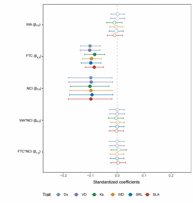 圖1. 夏季水資源可用性(WA)、冬季凍融循環(huán)(FTC)、鄰近擁擠度(NCI)及其相互作用對樹木生長速率的影響。