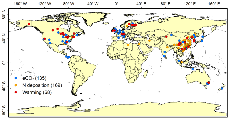 朱教君研究團(tuán)隊(duì)前期通過在溫帶森林:遼寧清原森林生態(tài)系統(tǒng)國(guó)家野外科學(xué)觀測(cè)研究站(清原森林站)、吉林長(zhǎng)白山森林生態(tài)系統(tǒng)國(guó)家野外科學(xué)觀測(cè)研究站(長(zhǎng)白山站)、東北林業(yè)大學(xué)尖砬溝森林培育實(shí)驗(yàn)站的研究發(fā)現(xiàn)(基于楊凱博士主持的優(yōu)青項(xiàng)目),叢枝菌根樹種具有相對(duì)易分解的凋落物,地表凋落層較?。幌喾?,外生菌根樹種具有相對(duì)難分解的凋落物,地表凋落物層較厚;土壤碳分布與凋落物碳變化則正好相反,但凋落物-土壤總的碳儲(chǔ)量為:以叢枝菌根樹種為主的林分高于以外生菌根樹種為主的林分達(dá)25%。上述研究結(jié)果的驅(qū)動(dòng)機(jī)制是什么?即,森林菌根介導(dǎo)的植物-土壤的碳積累到底發(fā)生了怎樣的變化?針對(duì)上述問題,該團(tuán)隊(duì)基于在清原森林站的監(jiān)測(cè)與研究結(jié)果,通過收集3050組全球變化背景下森林生物量、土壤碳及相關(guān)因子數(shù)據(jù)(圖1),并進(jìn)行了系統(tǒng)分析,明確了氮沉降、二氧化碳倍增、增溫等全球變化因子對(duì)森林生態(tài)系統(tǒng)植物-土壤碳積累的影響,揭示了外生菌根和叢枝菌根植物-土壤碳分配策略對(duì)全球變化的響應(yīng)規(guī)律。