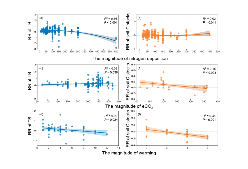 圖2森林生態(tài)系統(tǒng)生物量、土壤碳對(duì)全球變化強(qiáng)度的響應(yīng)