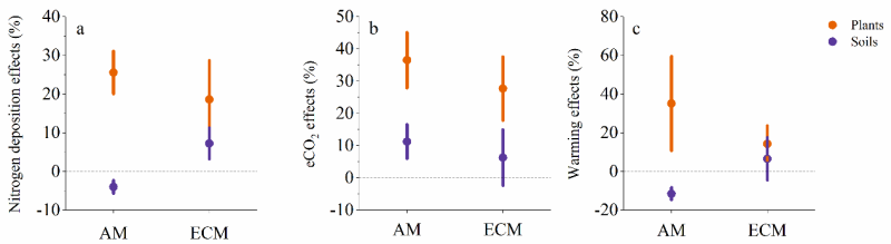 基于外生菌根和叢枝菌根樹種對(duì)養(yǎng)分的利用策略不同,以及菌根自身屬性對(duì)全球變化敏感性不同,進(jìn)一步將森林劃分為以外生菌根樹種為主的森林和以叢枝菌根樹種為主的森林。研究發(fā)現(xiàn),森林樹種菌根類型是調(diào)控植物-土壤碳固持的關(guān)鍵要素(圖3)。在氮沉降、增溫下,盡管森林土壤碳無顯著變化,但不同菌根樹種占主導(dǎo)的森林土壤碳發(fā)生了顯著變化,即叢枝菌根樹種占主導(dǎo)的森林土壤碳顯著降低,而外生菌根樹種占主導(dǎo)的森林土壤碳則顯著升高,且不同菌根樹種森林的植物-土壤碳二者之間存在著權(quán)衡關(guān)系;如,與外生菌根樹種占主導(dǎo)的森林生物量相比,叢枝菌根樹種占主導(dǎo)的森林生物量增加更多。上述結(jié)果為準(zhǔn)確評(píng)估全球變化下森林生態(tài)系統(tǒng)碳積累提供了重要參考。