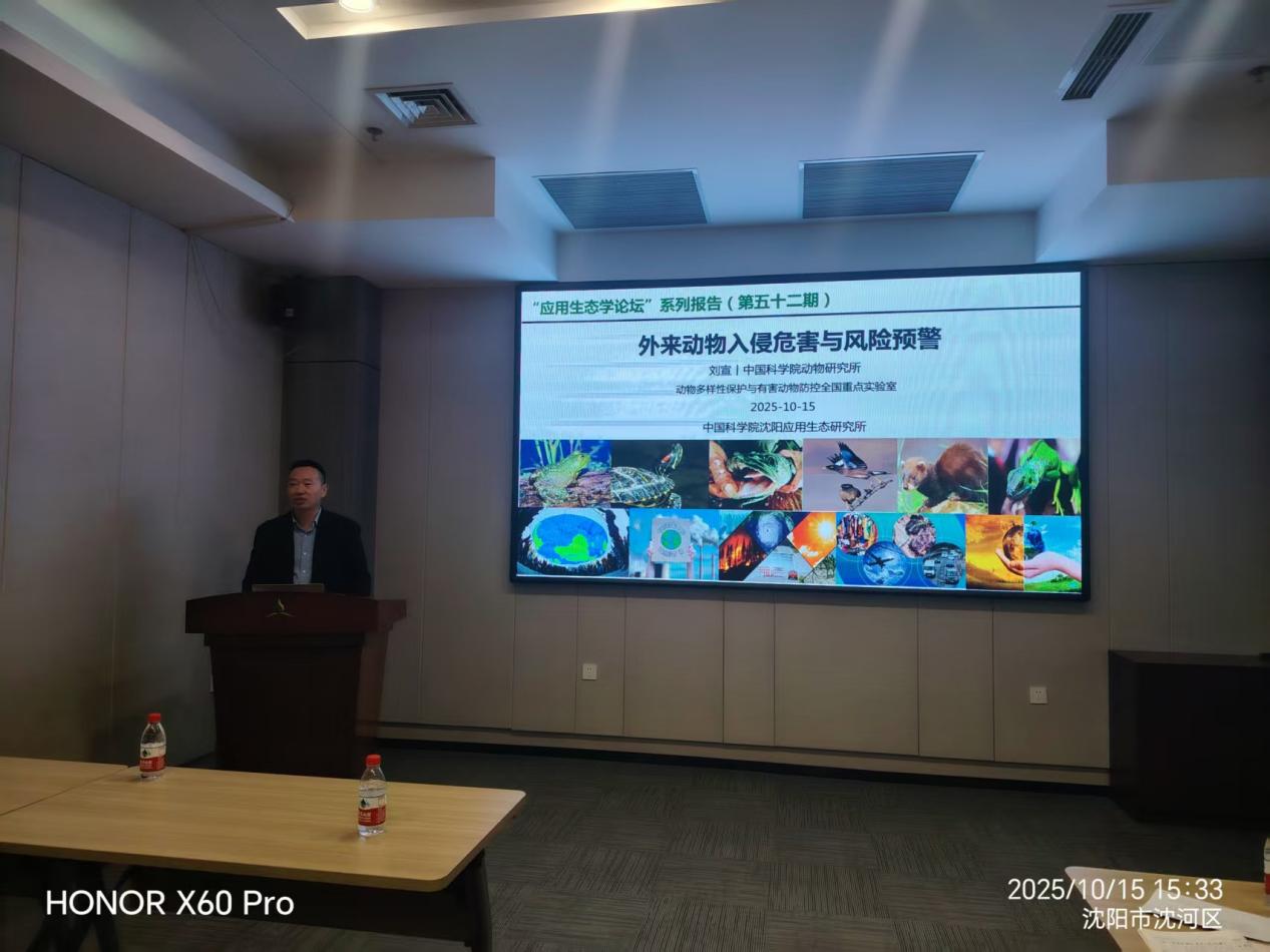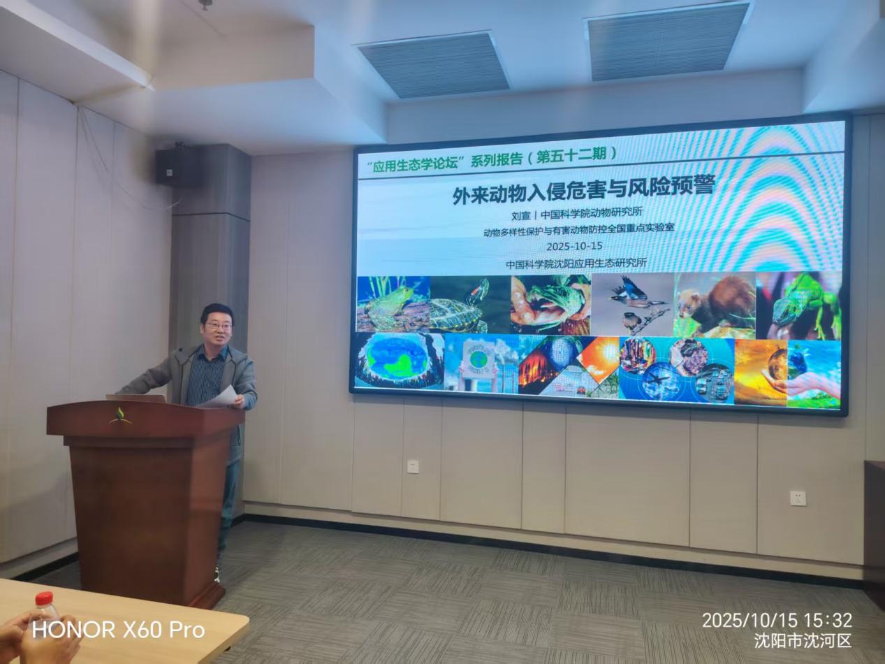 2025年10月15日,中國(guó)科學(xué)院沈陽應(yīng)用生態(tài)研究所成功舉辦第五十二期“應(yīng)用生態(tài)學(xué)論壇”。本期論壇特邀中國(guó)科學(xué)院動(dòng)物研究所劉宣研究員擔(dān)任主講嘉賓,圍繞“外來兩棲動(dòng)物入侵危害與風(fēng)險(xiǎn)預(yù)警”展開專題報(bào)告,吸引了所內(nèi)外30余名科研人員參與。呂曉濤研究員主持活動(dòng)。