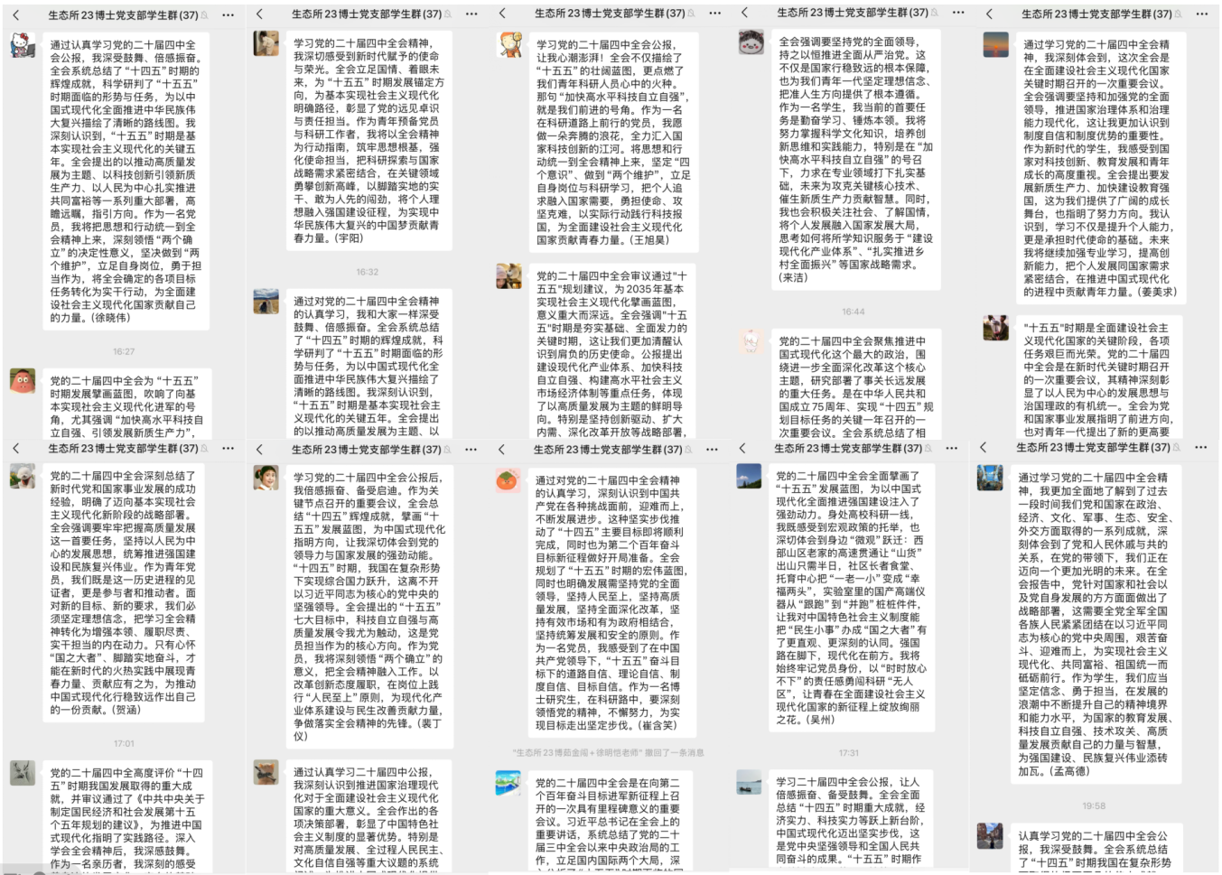 會前,王寶玉在支部群內(nèi)轉(zhuǎn)發(fā)了研究所黨群辦下發(fā)的學(xué)習(xí)輔導(dǎo)PPT,各位黨員同志以及入黨積極分子在深入學(xué)習(xí)后紛紛在群內(nèi)分享了自己的學(xué)習(xí)感悟和心得體會。