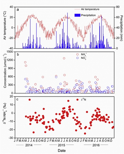 圖2. 清原站每日大氣平均溫度和降雨量(a),降水中銨態(tài)氮和硝態(tài)氮含量(b)及銨氮15N自然豐度