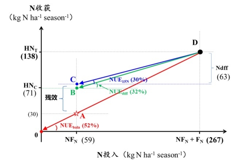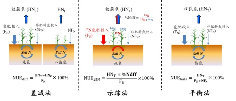 為了解決這一問題,中國科學(xué)院沈陽應(yīng)用生態(tài)研究所穩(wěn)定同位素生態(tài)學(xué)研究團(tuán)隊(duì)與美國馬里蘭大學(xué)環(huán)境科學(xué)研究中心阿巴拉契亞實(shí)驗(yàn)室合作,系統(tǒng)梳理了三種常用的NUE量化方法的科學(xué)內(nèi)涵、差異原因和潛在聯(lián)系(圖1,2)。首先,該研究給出了差減法(NUEdiff)、15N同位素示蹤法(簡(jiǎn)稱示蹤法,NUE15N)和生態(tài)系統(tǒng)氮收支平衡法(簡(jiǎn)稱平衡法,NUEbala)三種量化方法的概念、內(nèi)在假設(shè)和應(yīng)用尺度。差減法根據(jù)施氮和不施氮兩個(gè)處理的作物氮吸收量差異來量化作物氮利用效率,計(jì)算公式為:NUEdiff = (施氮處理作物氮吸收量 - 不施氮處理作物氮吸收量) / 肥料氮投入量 × 100%。示蹤法根據(jù)15N標(biāo)記氮在作物收獲部分的回收比例來量化作物氮利用效率,計(jì)算公式為:NUE15N = (作物氮吸收量 × 作物吸收來自標(biāo)記氮的比例) / 肥料氮投入量 × 100%。平衡法是指作物氮吸收量占總氮投入量的比例,計(jì)算公式為:NUEbala = 作物氮吸收量 / 總氮投入量 × 100%。該研究進(jìn)一步指出導(dǎo)致三種NUE量化結(jié)果差異的原因:一是對(duì)氮投入的定義不同,其中差減法和示蹤法僅針對(duì)肥料氮投入,平衡法針對(duì)所有氮投入,包括來自大氣沉降的氮輸入;二是對(duì)氮投入“土壤殘留效應(yīng)”(即殘留在土壤的肥料氮對(duì)后季作物氮吸收的貢獻(xiàn))的涵蓋范圍不同,差減法和示蹤法不涉及或較少涉及土壤殘留效應(yīng),而平衡法則主要涉及了土壤殘留效應(yīng)。之后,該研究以全國尺度的農(nóng)戶調(diào)研數(shù)據(jù)和田間試驗(yàn)數(shù)據(jù)為依托,采用差減法、示蹤法和平衡法量化了我國糧食作物的氮利用效率,結(jié)果分別為32%、30%和52%,并以此為例演示了三種方法之間的差異和聯(lián)系(圖2)。最后,該研究總結(jié)了不同NUE量化方法的優(yōu)缺點(diǎn),建議相關(guān)人員根據(jù)不同需要和目的選用恰當(dāng)?shù)牧炕椒?,在比較時(shí)需采用統(tǒng)一標(biāo)準(zhǔn)以增加可比性。