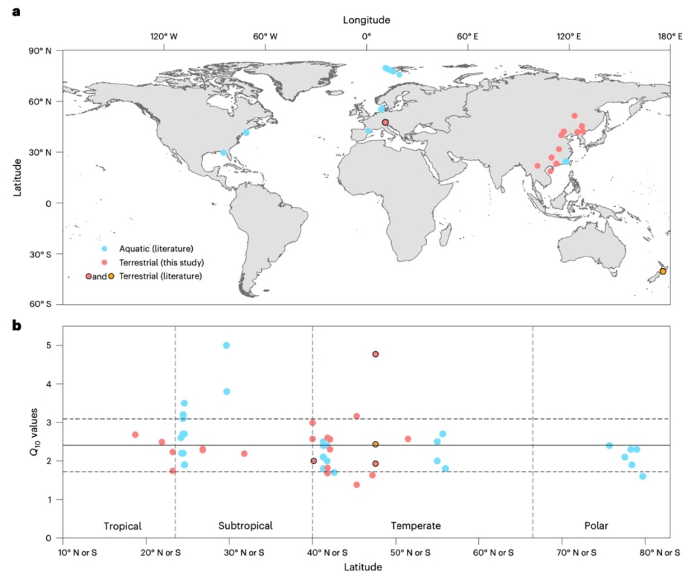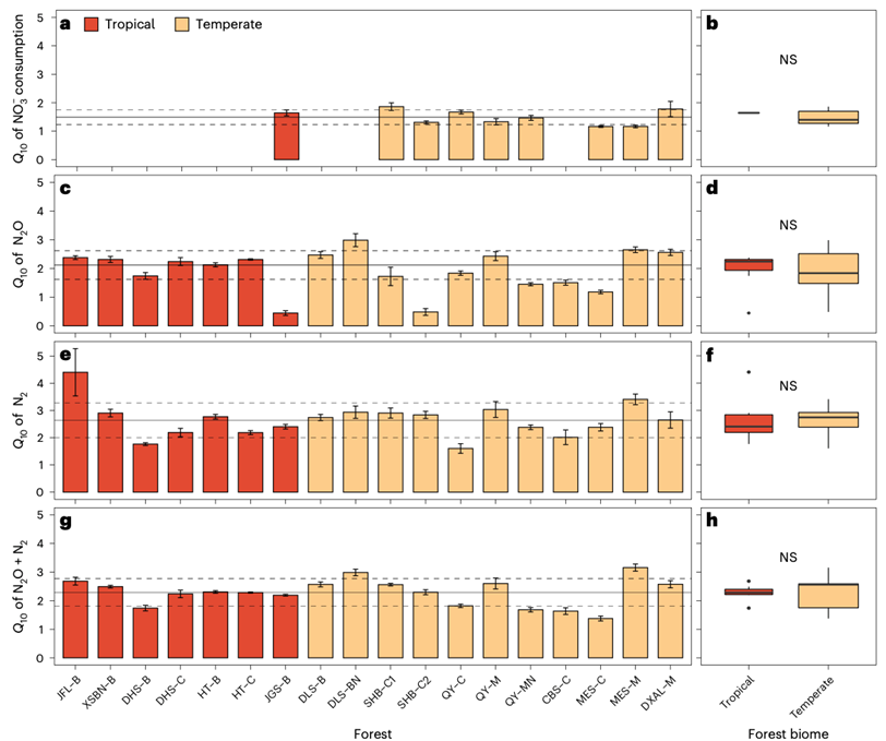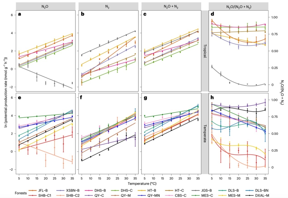 這項研究成果以“Universal temperature sensitivity of denitrification nitrogen losses in forest soils”為題于2023年6月22日發(fā)表在Nature Climate Change上(IF2021=28.66)。中國科學(xué)院沈陽應(yīng)用生態(tài)研究所于浩明博士生為第一作者,方運(yùn)霆研究員和中國科學(xué)院地理科學(xué)與資源研究所張揚(yáng)建研究員為共同通訊作者。合作者還有挪威生命科學(xué)大學(xué)Jan Mulder教授和Peter Do?rsch教授、美國紐約州立大學(xué)朱偉興教授、中國科學(xué)院青藏高原研究所旭日研究員等。該研究受到國家重點研發(fā)計劃(2016YFA0600802)和中國科學(xué)院盧嘉錫國際團(tuán)隊項目(GJTD-2018-07)等項目資助。