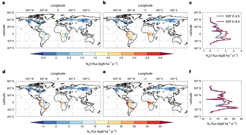a-c和d-f圖分別為SSP2-4.5和SSP5-8.5情景模式下的氣態(tài)氮釋放模擬結(jié)果。