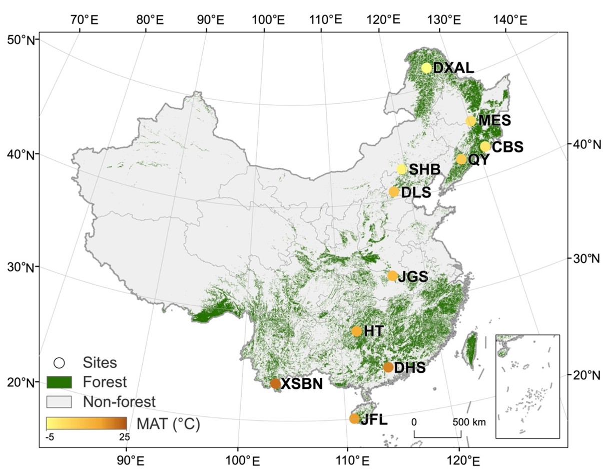 針對上述問題,中國科學(xué)院沈陽應(yīng)用生態(tài)研究所方運(yùn)霆研究員團(tuán)隊與中國科學(xué)院地理科學(xué)與資源研究所張揚(yáng)建團(tuán)隊等建立了15N標(biāo)記量化土壤N2O和N2產(chǎn)生速率的技術(shù),對中國18個森林土壤反硝化作用N2O和N2產(chǎn)生速率的溫度敏感性進(jìn)行了研究,探討了主要驅(qū)動因素,并利用生態(tài)系統(tǒng)過程模型(DyN-LPJ)結(jié)合室內(nèi)培養(yǎng)的溫度敏感性結(jié)果模擬了未來變暖情形下全球森林土壤反硝化作用氣態(tài)氮釋放的響應(yīng)。研究的18個森林站點從南到北相距4000 km,緯度相差33°(圖1),覆蓋了廣泛的氣候梯度(年均溫相差25°C,年降水量相差2000 mm)。