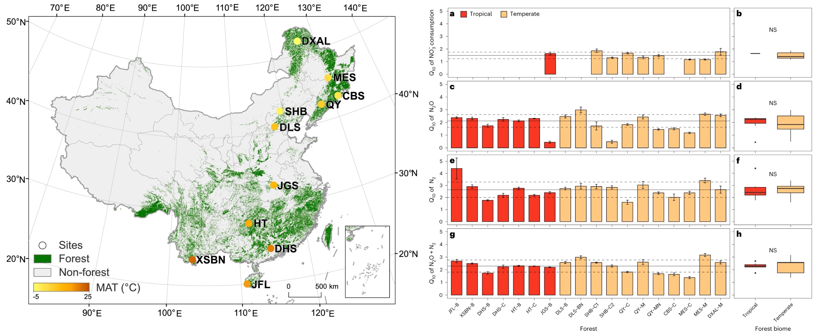 該成果于2023年7月發(fā)表在《Nature Climate Change》期刊,作為首個(gè)利用穩(wěn)定同位素技術(shù)手段系統(tǒng)量化森林生態(tài)系統(tǒng)氣態(tài)氮損失溫度敏感性的研究,為過(guò)程模型的建立和改進(jìn)提供了重要的數(shù)據(jù)參數(shù),對(duì)于深入理解變暖背景下陸地生態(tài)系統(tǒng)復(fù)雜的碳氮耦合過(guò)程及其對(duì)變暖的反饋具有極大的推動(dòng)作用。