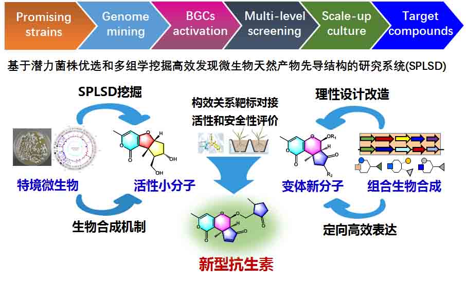 農(nóng)業(yè)微生物與合成生物技術(shù)組立足于特境微生物這一戰(zhàn)略生物資源,瞄準(zhǔn)國際社會對抗感染、抗腫瘤創(chuàng)新藥物以及現(xiàn)代農(nóng)業(yè)生物制品的重大需求,圍繞如何高效創(chuàng)制新靶點(diǎn)新型藥物和高效利用農(nóng)業(yè)微生物資源等技術(shù)難題,一方面挖掘海洋微生物、植物內(nèi)生菌等特境微生物資源,利用集成篩選技術(shù)發(fā)掘抗病、抗逆、促生等功能微生物菌種,并進(jìn)行產(chǎn)業(yè)化開發(fā);另一方面依據(jù)新生境→新物種→新基因→新產(chǎn)物→新機(jī)制→新藥物的研究思路,建立新穎活性天然產(chǎn)物高效發(fā)掘體系,發(fā)現(xiàn)具有抗腫瘤、抗感染、殺菌或生物刺激素等醫(yī)用和農(nóng)用功效的先導(dǎo)化合物,通過組合生物合成或化學(xué)修飾提高先導(dǎo)分子成藥性,采用合成生物學(xué)與代謝工程改造構(gòu)建可用于工業(yè)化生產(chǎn)的高產(chǎn)菌種,并最終為產(chǎn)品登記與應(yīng)用而持續(xù)努力。
