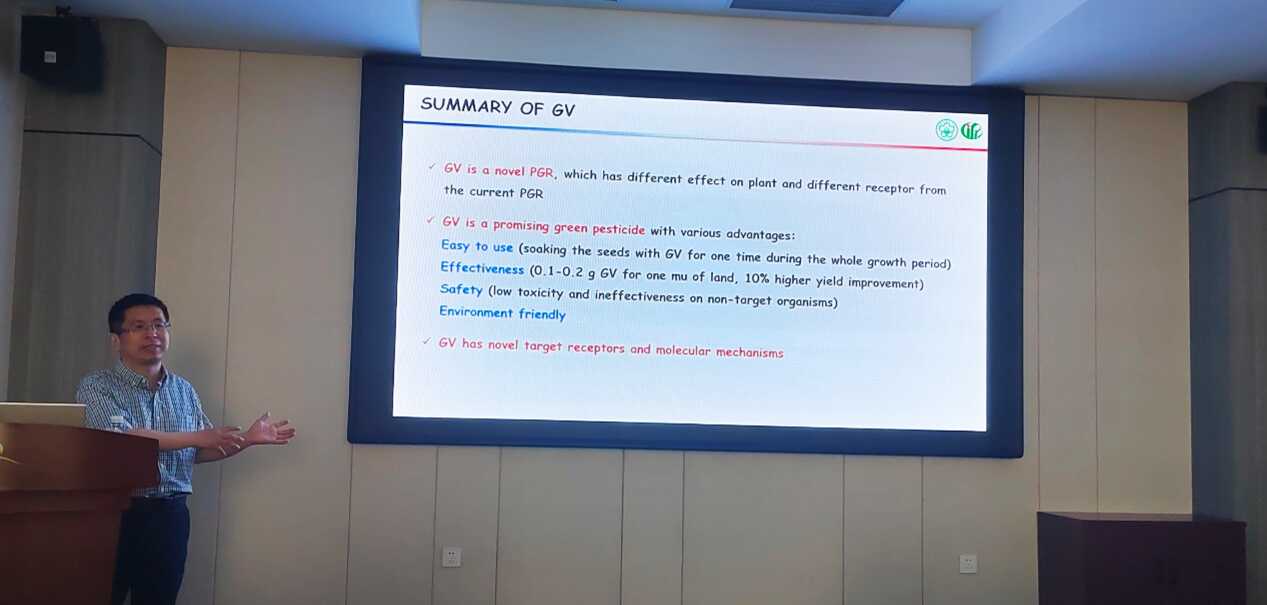 向文勝教授以“微生物天然產物農藥谷維菌素的發(fā)現(xiàn)、生物合成及作用機制”為題,詳細介紹了從重樓根際微生物Streptomyces sp. NEAU6發(fā)酵液中發(fā)現(xiàn)核苷類生長調節(jié)劑谷維菌素的研究歷程,闡明了鏈霉菌NEAU6生物合成谷維菌素的代謝途徑和酶催化機制,揭示了谷維菌素通過抑制鳥嘌呤合成關鍵酶GMPs發(fā)揮抗病促生作用的新穎機制,以及分享了新農藥谷維菌素以5500萬元成果轉讓上市公司遠大集團背后的故事。