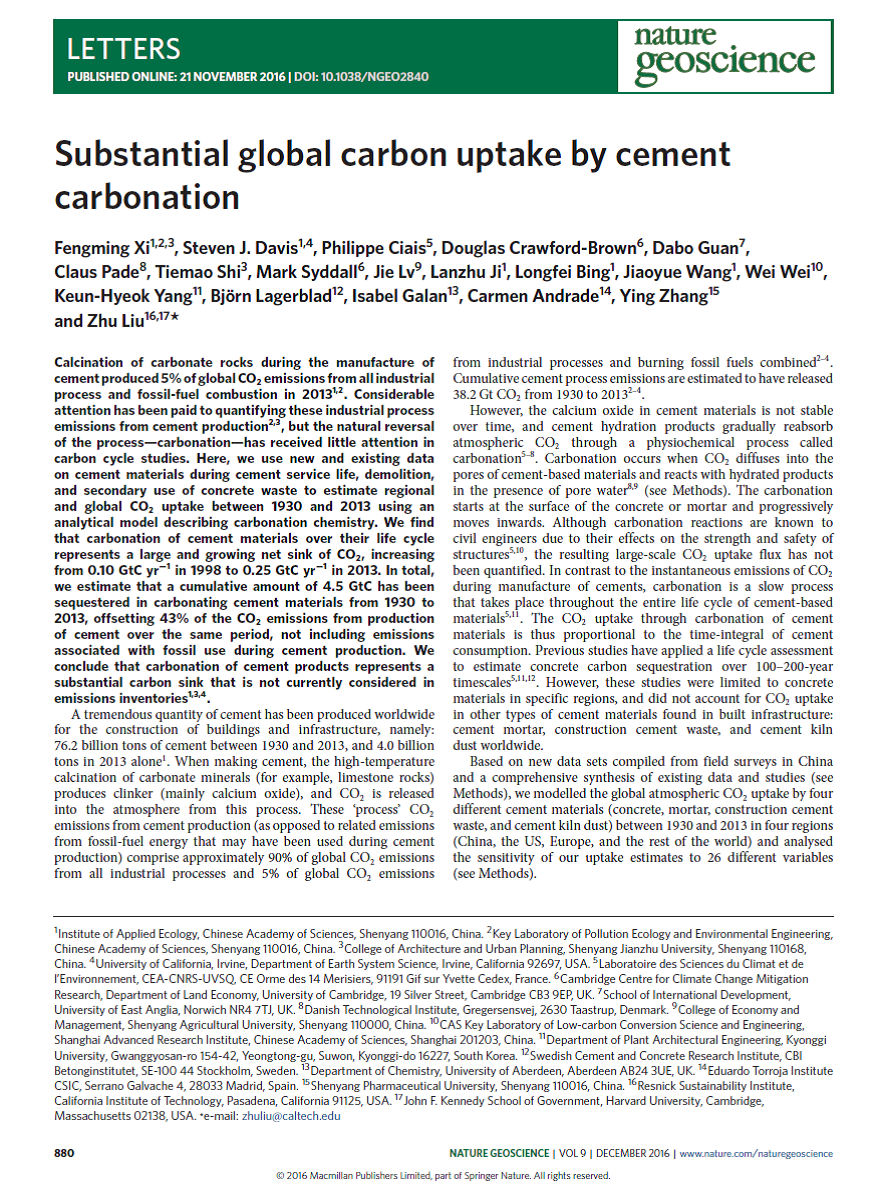 相關論文《Substantial global carbon uptake by cement carbonation》發(fā)表在Nature子刊Nature Geoscience上