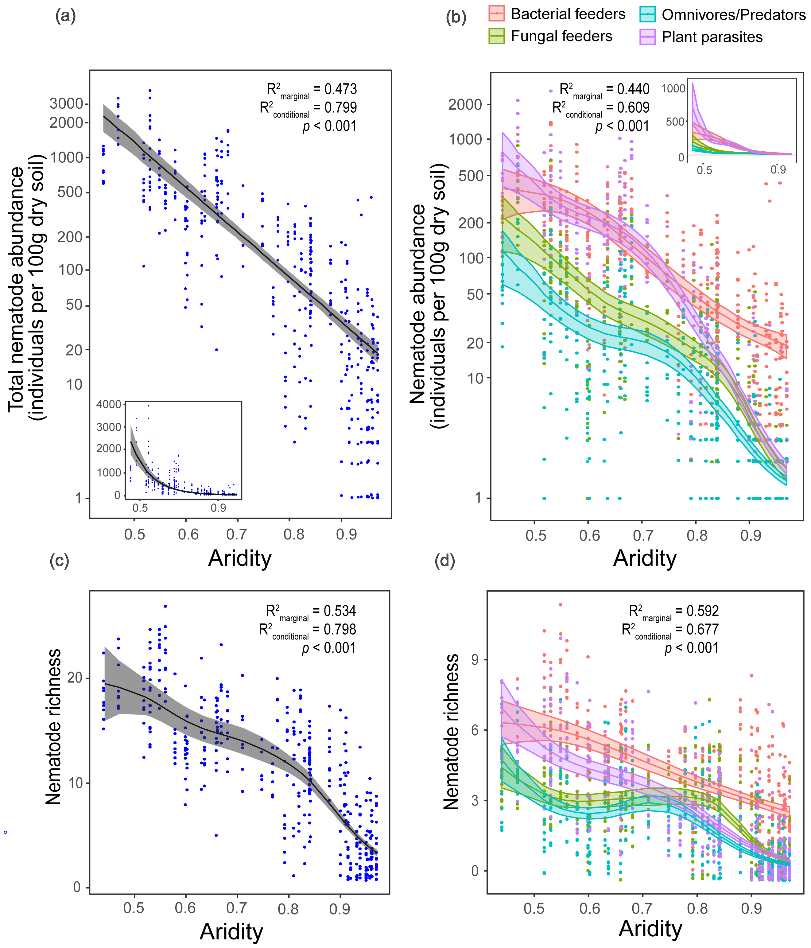 研究結(jié)果以“Nonlinear responses of soil nematode community composition to increasing aridity”為題發(fā)表于Global Ecology and Biogeography期刊上,土壤生態(tài)組熊丹博士和植物所魏存爭博士為共同第一作者,李琪研究員為通訊作者,該研究得到國家重點研發(fā)計劃和國家自然科學基金項目的支持。