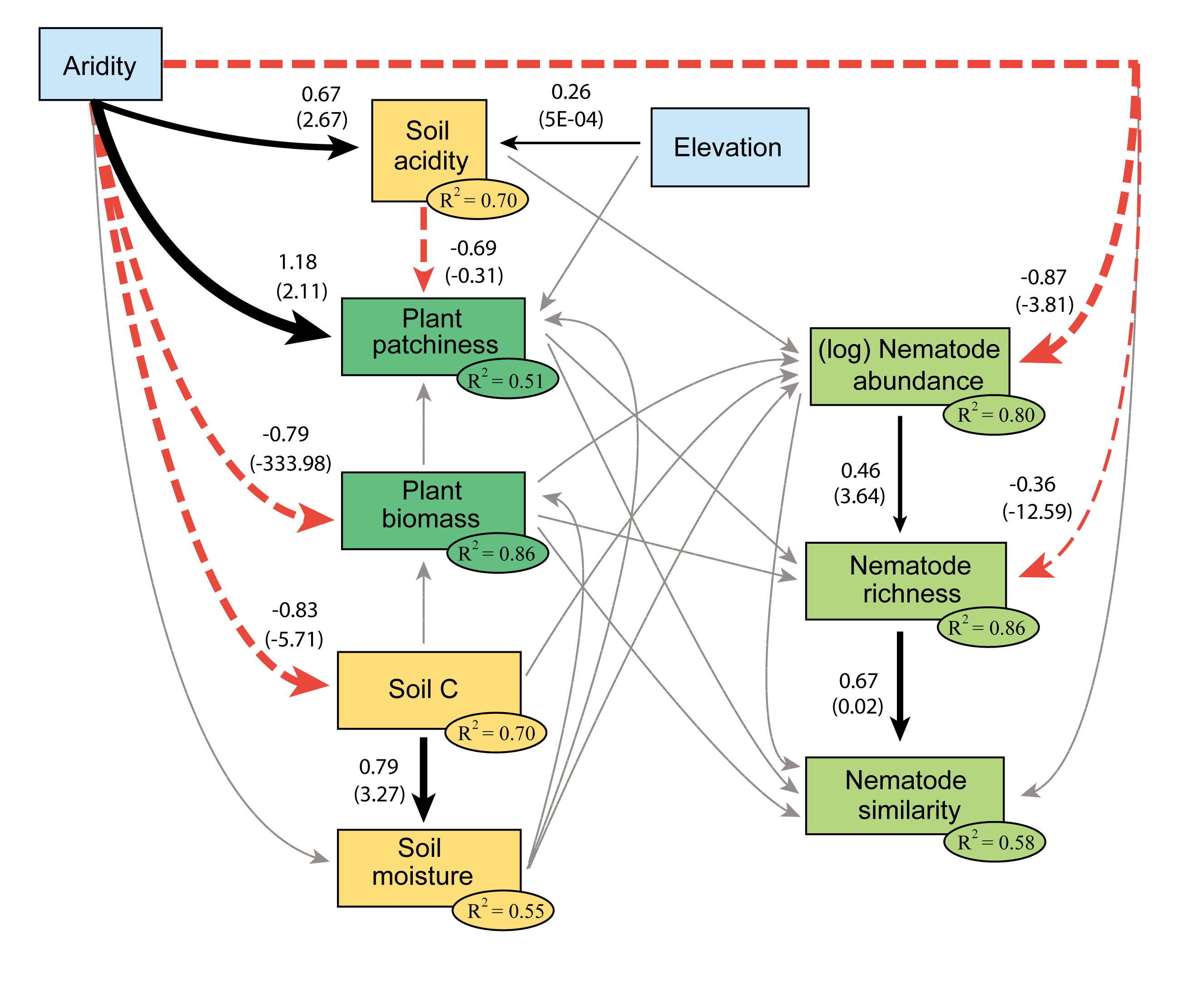 干旱等全球范圍內(nèi)的氣候變化問題日益嚴重,并對陸地生態(tài)系統(tǒng)的結(jié)構(gòu)和功能產(chǎn)生了重大影響。一般而言,干旱能夠降低草地土壤生物群落多度和豐富度,并導致不同營養(yǎng)類群之間的差異化響應(yīng)。然而,相比于地上生態(tài)群落,對土壤生物群落的研究都是短期的小尺度研究,缺乏較大尺度上的機理研究。