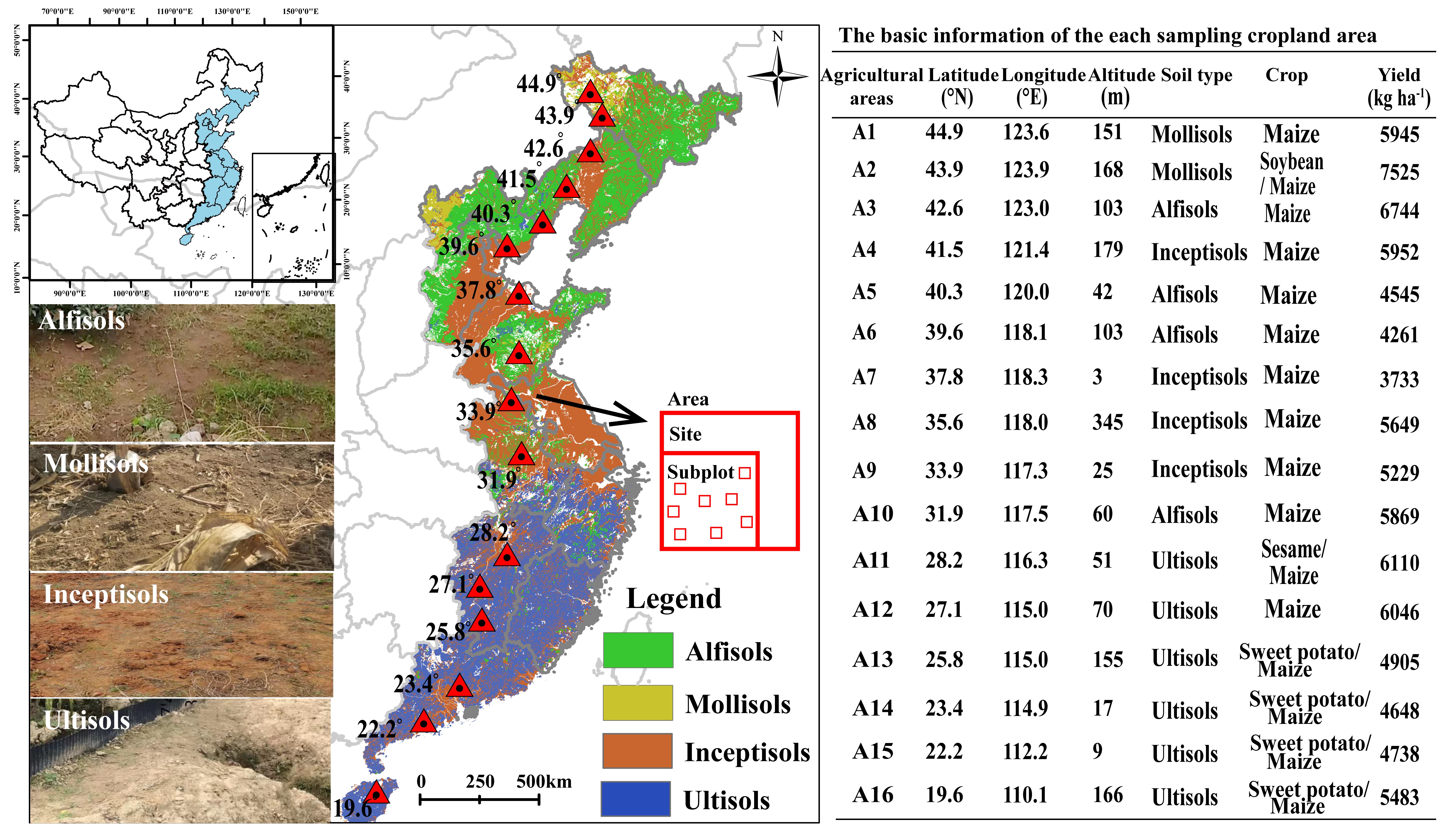 圖1. 中國東部農(nóng)區(qū)采樣點基本信息