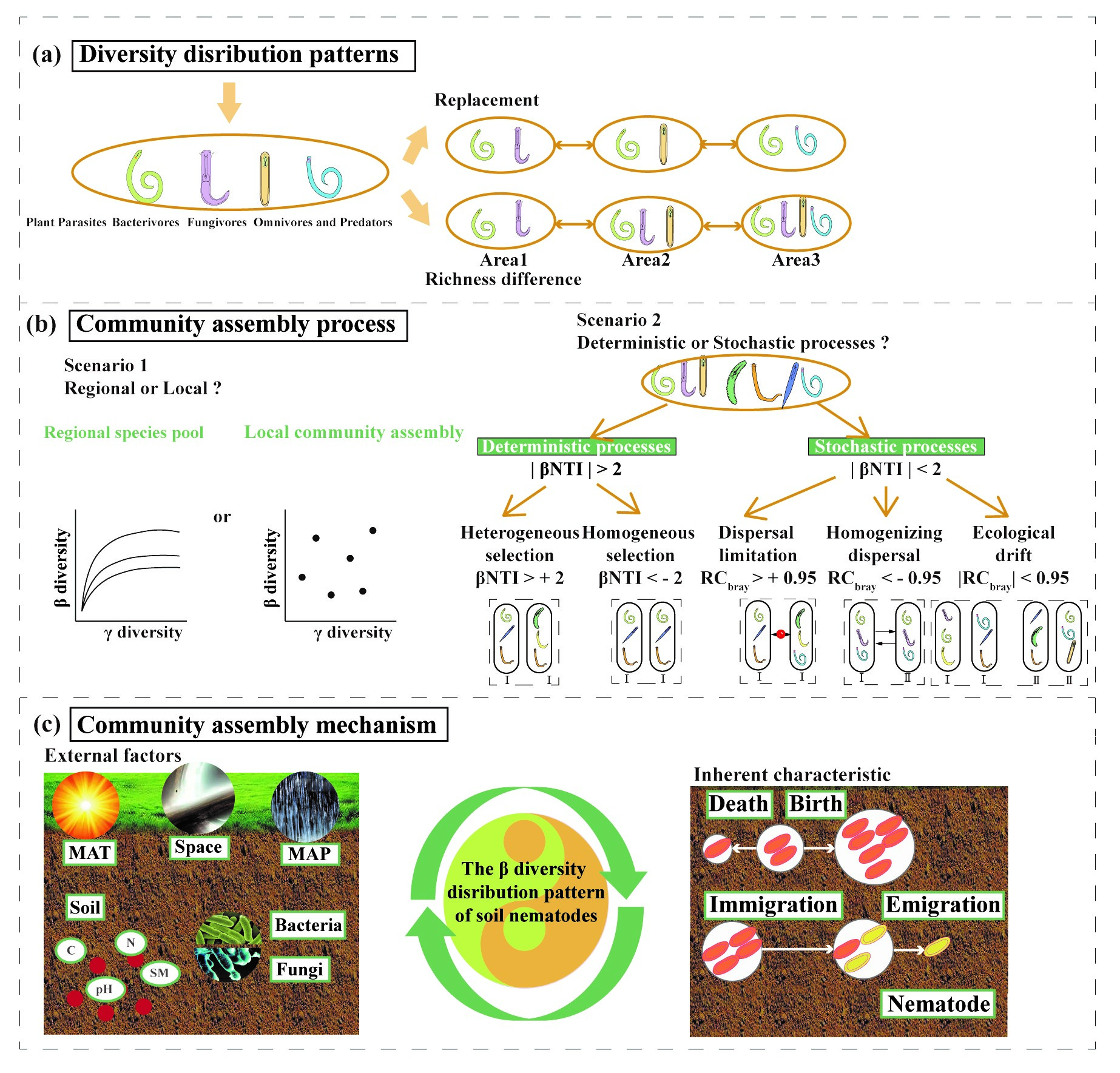 圖3. 小型土壤動物β多樣性分布模式和群落聚集機制研究的概念圖