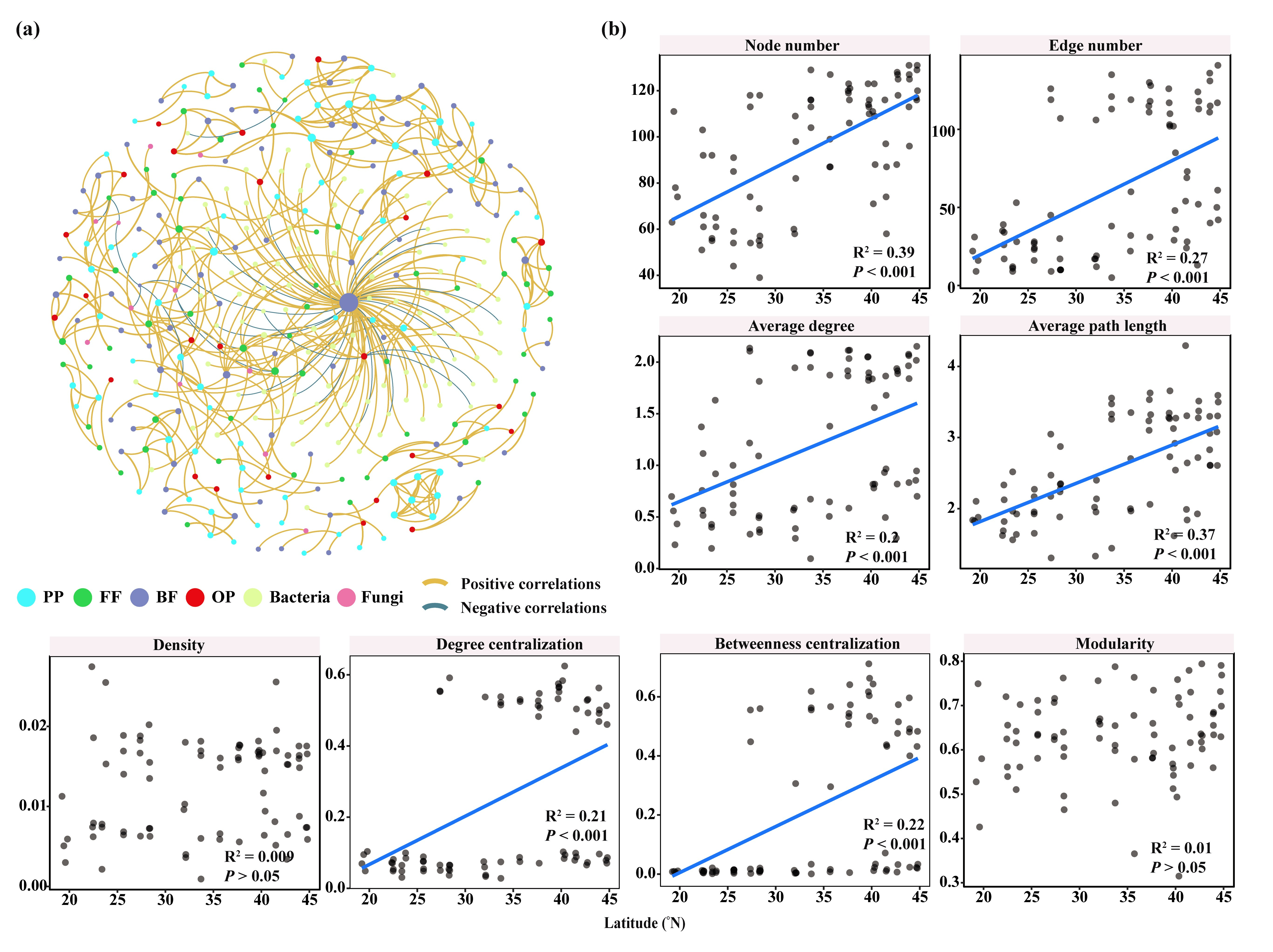 研究結(jié)果表明,植物寄生線蟲、食真菌線蟲和食細菌線蟲的β多樣性隨著緯度增加呈下降趨勢。小型土壤動物的相似性隨著地理距離的增加而減小,表現(xiàn)出較強的距離衰減模式。當(dāng)?shù)厝郝浣M裝機制(local community assembly)對小型土壤動物群落構(gòu)建起主導(dǎo)作用,且隨機性過程占比高于確定性過程。氣候因素和土壤因素直接影響土壤微生物和植物寄生線蟲,并通過它們間接影響食細菌線蟲、食真菌線蟲和捕食雜食線蟲。其中,土壤微生物群落與小型土壤動物之間存在著密切的營養(yǎng)級聯(lián)關(guān)系,其生物網(wǎng)絡(luò)復(fù)雜性沿緯度梯度呈顯著增加趨勢(圖4)。對于小型土壤動物多樣性分布模式和群落聚集過程的探索,增強了對大尺度土壤生物多樣性分布格局和維持機制的理解。
