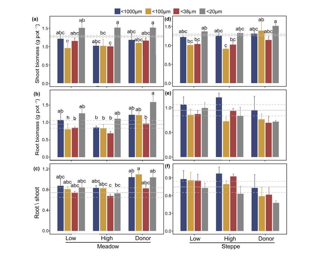 ????針對(duì)這一科學(xué)問題,研究團(tuán)隊(duì)依托土壤接種的野外試驗(yàn)平臺(tái),采集土壤進(jìn)行了土壤接種遺留效應(yīng)的微觀模擬實(shí)驗(yàn),進(jìn)一步評(píng)估植物-土壤互作機(jī)制。研究發(fā)現(xiàn),在退化草地上進(jìn)行土壤接種4年后,土壤接種的遺留效應(yīng)仍會(huì)影響土壤微生物群落組成和植物生長(zhǎng)。小型土壤生物(< 20 μm),特別是土壤真菌,對(duì)遺留效應(yīng)的形成和植物生長(zhǎng)更為重要。