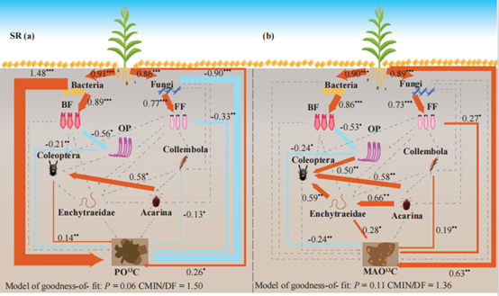 綜上,該研究率先明確了“秸稈還田→土壤食物網(wǎng)重構→光合碳高效轉(zhuǎn)化→土壤碳固存”的鏈式調(diào)控機制,證實秸稈還田通過激發(fā)效應與更新效應的協(xié)同作用,推動光合碳向土壤穩(wěn)定碳庫分配,且小型土壤動物在其中發(fā)揮核心調(diào)控作用。研究結果為優(yōu)化保護性農(nóng)業(yè)措施、提升農(nóng)田土壤碳匯能力提供了關鍵的生物學依據(jù),同時也為理解“地上—地下生態(tài)系統(tǒng)協(xié)同調(diào)控”機制提供了新視角。