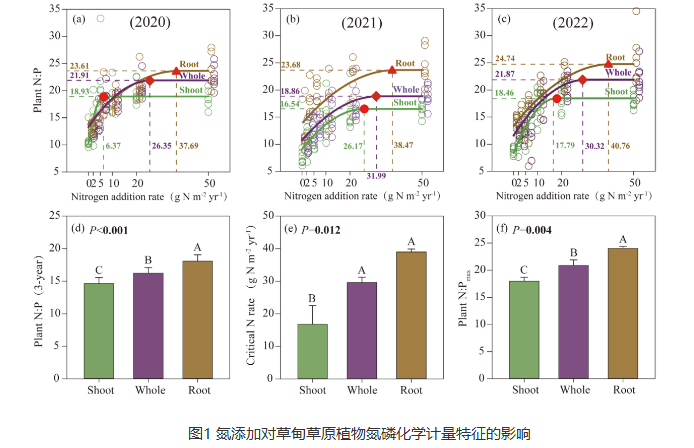 氮磷平衡對(duì)維持生態(tài)系統(tǒng)功能具有重要作用。植物的氮磷化學(xué)計(jì)量比(N:P)關(guān)系到生產(chǎn)力形成、養(yǎng)分循環(huán)等多重生態(tài)系統(tǒng)功能。植物可以在一定程度上調(diào)控自身體內(nèi)氮磷平衡,但不同器官的穩(wěn)態(tài)調(diào)節(jié)能力可能存在差別。根系貢獻(xiàn)了溫帶草原總初級(jí)生產(chǎn)力的60%~70%,其氮磷化學(xué)計(jì)量特征及其穩(wěn)態(tài)維持能力尚不清晰。已有研究證實(shí),作為全球變化重要驅(qū)動(dòng)力之一的氮素富集能夠提高植物地上器官中的N:P,但尚不清楚根系會(huì)發(fā)生何種響應(yīng),這制約著全球變化背景下對(duì)氮磷生物地球化學(xué)循環(huán)的精準(zhǔn)預(yù)測(cè)。